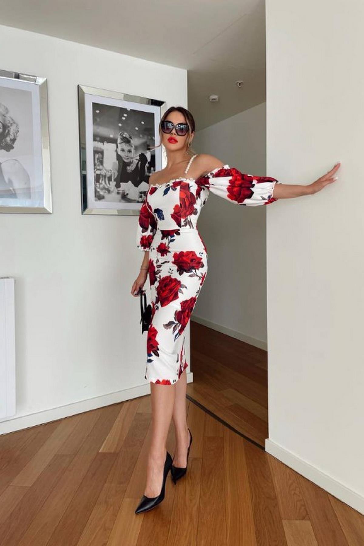 Askılı Gül Desenli Beyaz Midi Boy Elbise