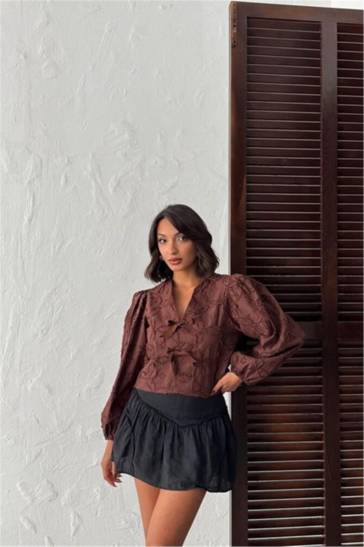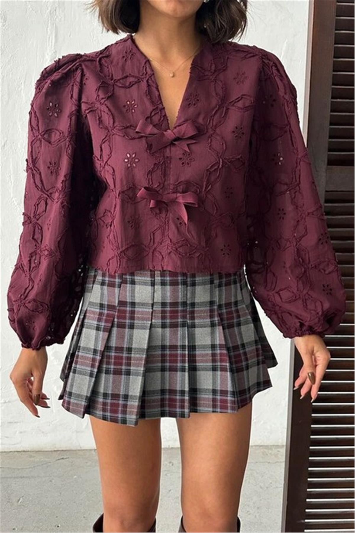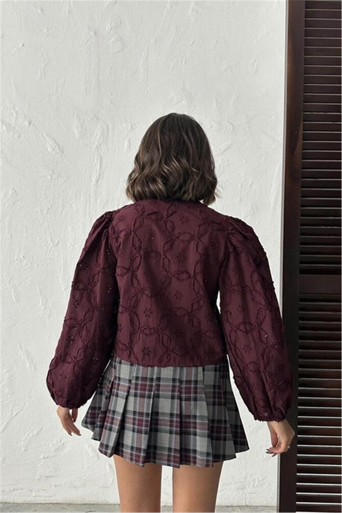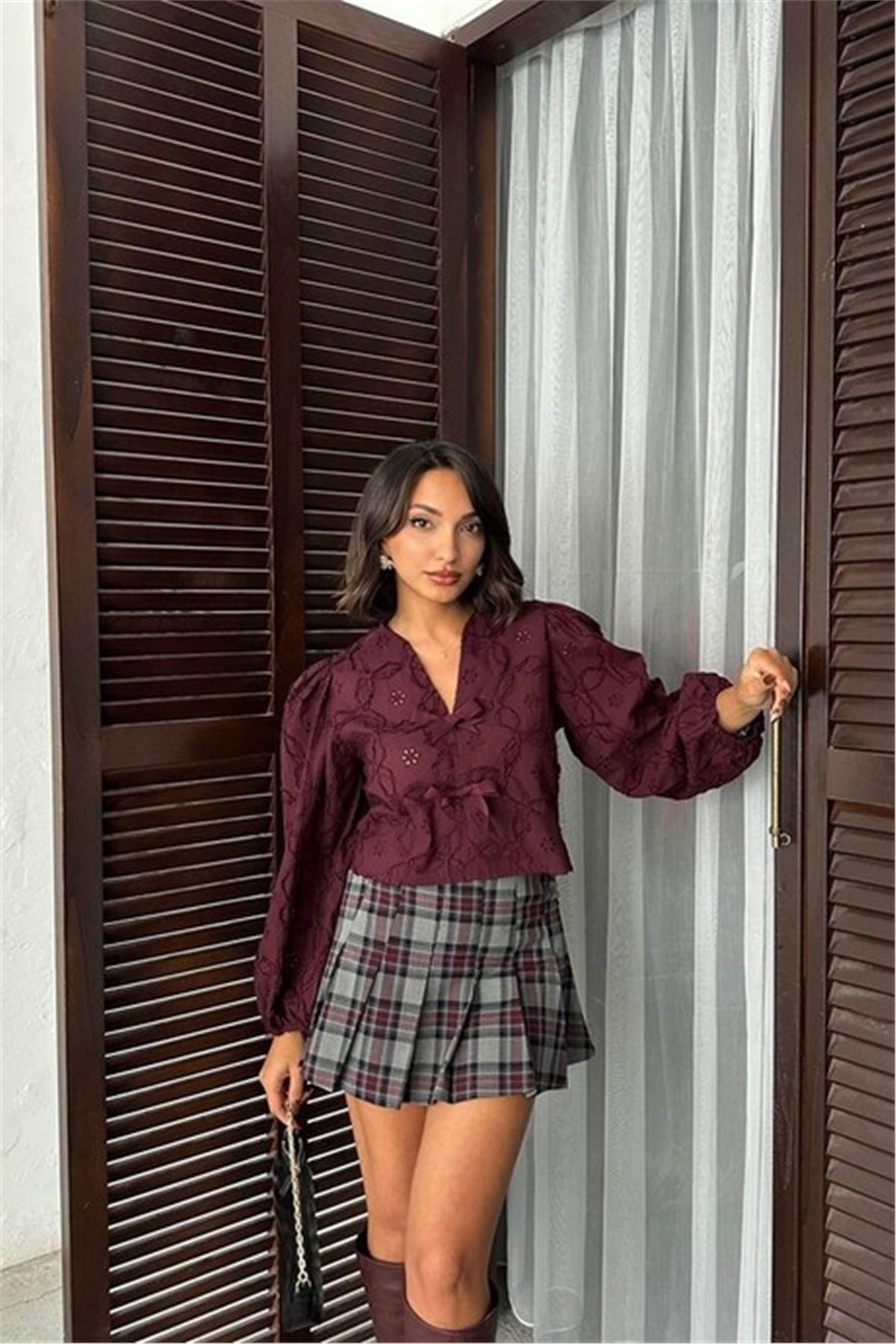 Dantel İşlemeli Fırfır Detaylı Bordo Bluz