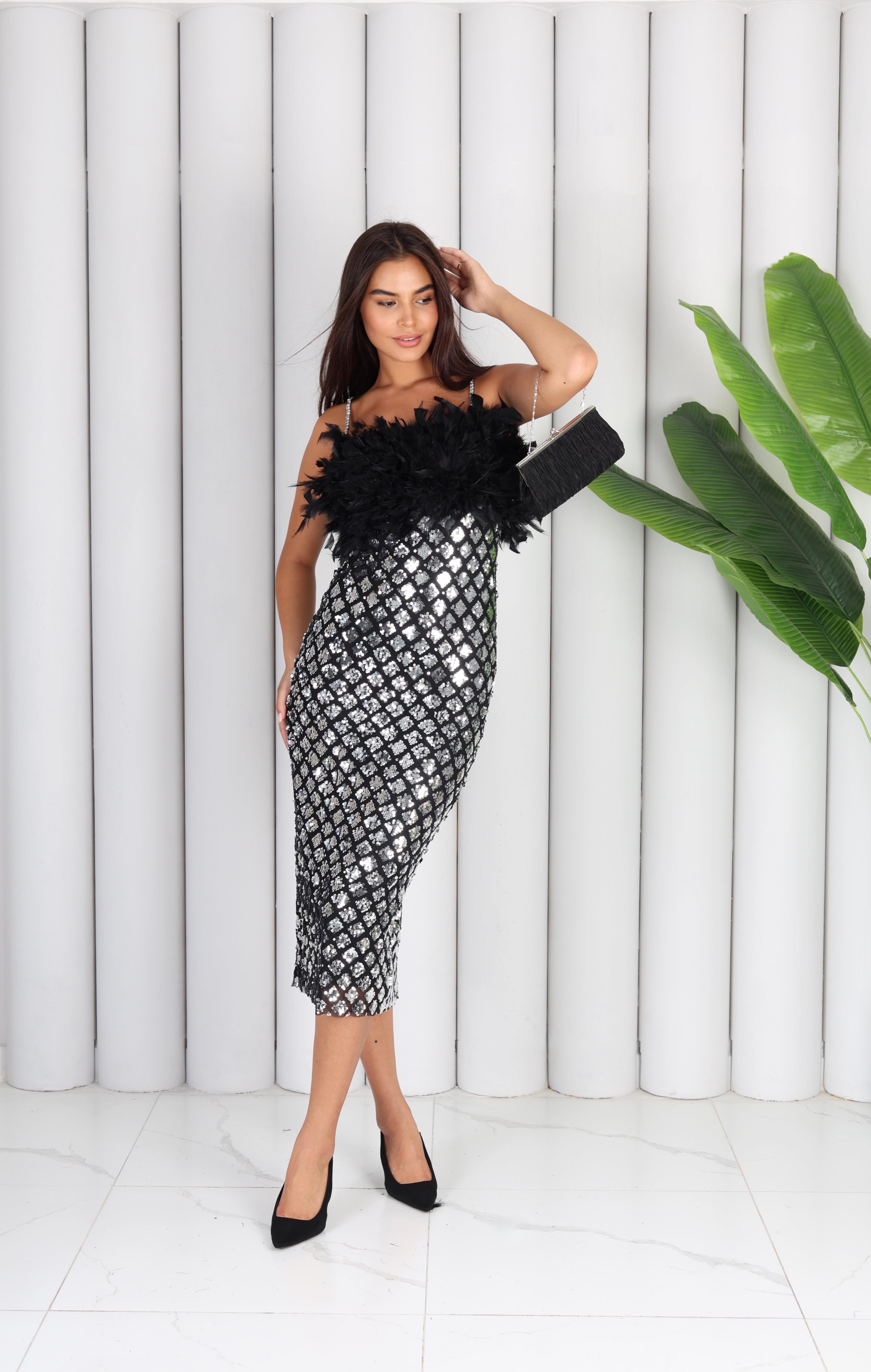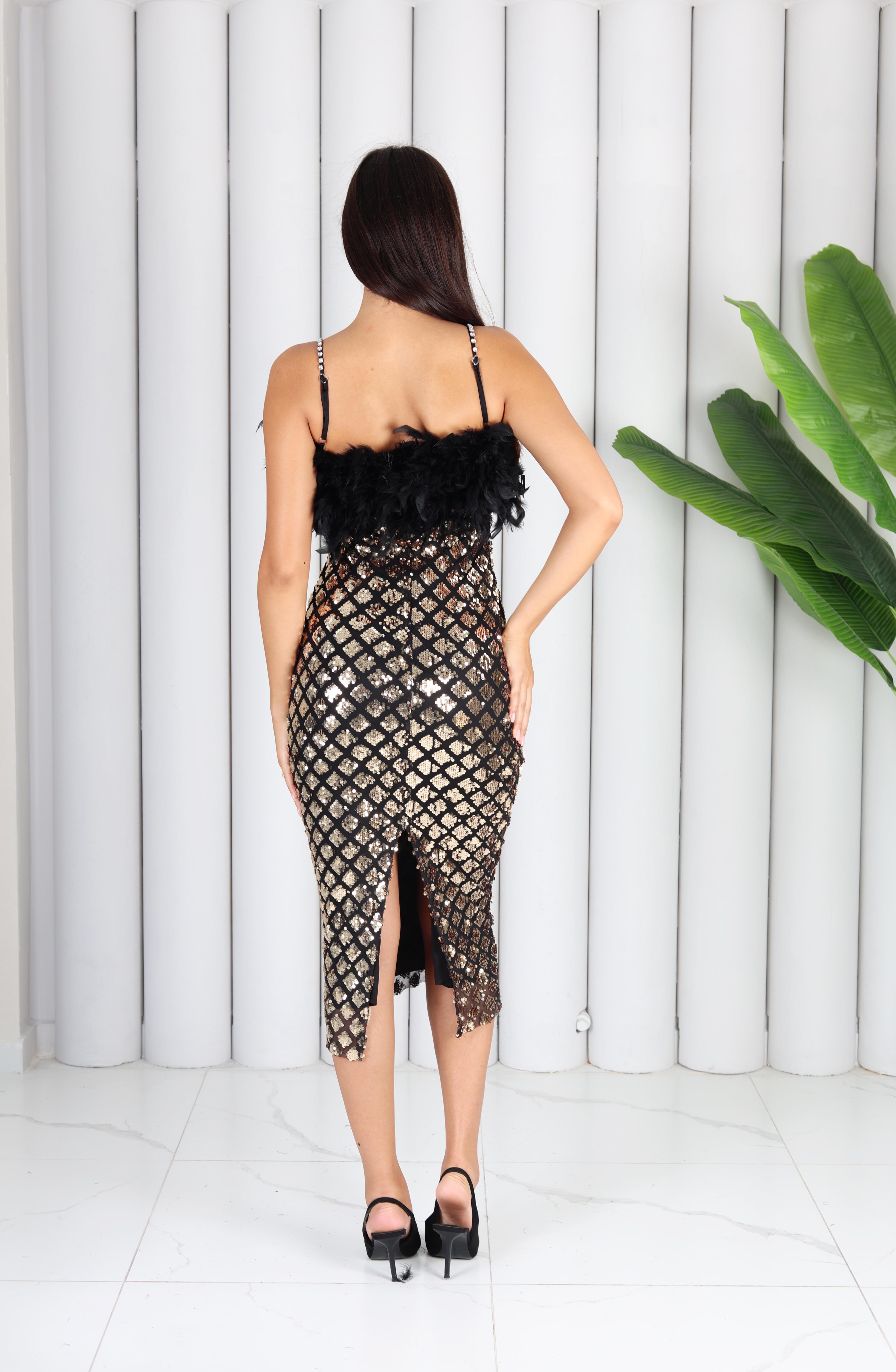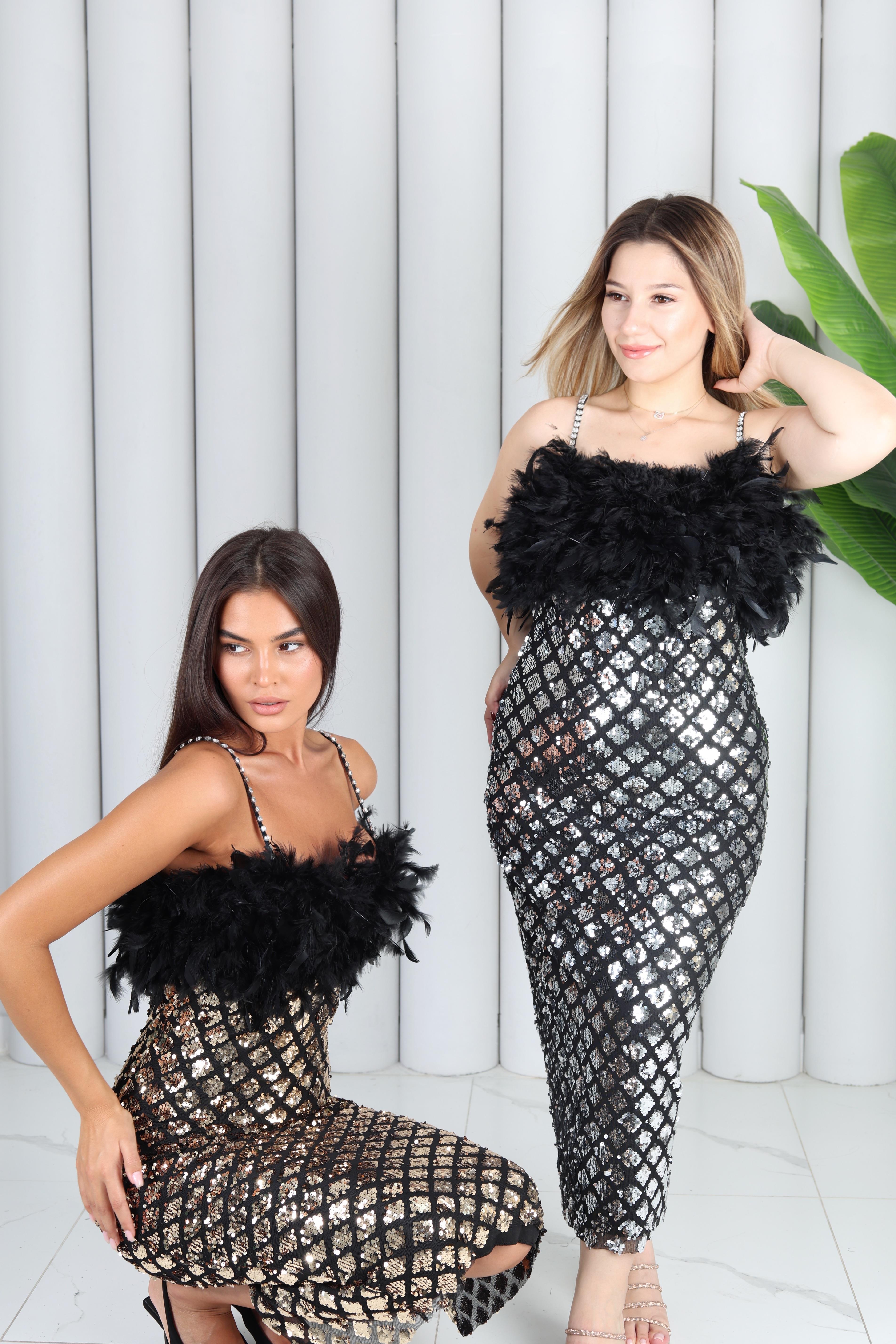 Askılı Göğüs Tüylü Midi Boy Parıltılı Siyah Elbise