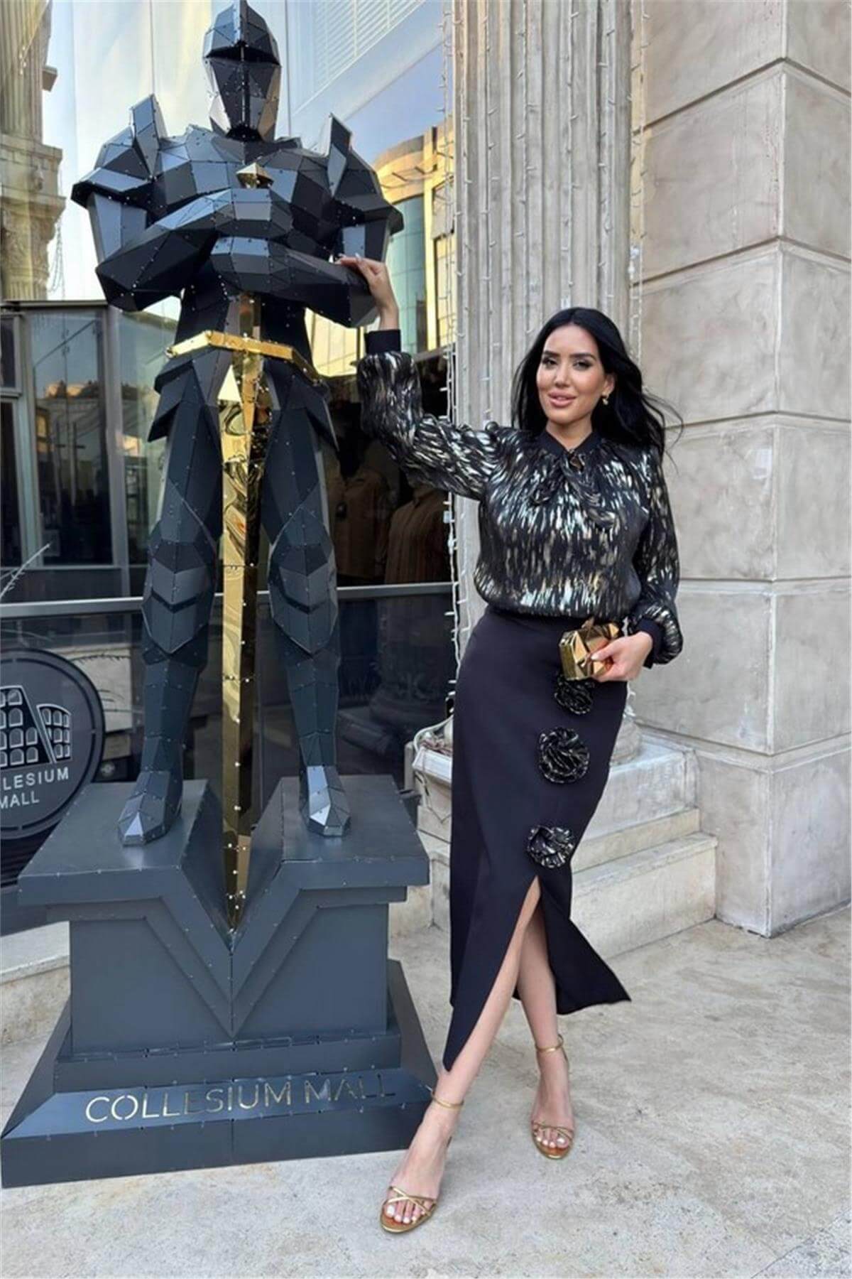 Desenli Gömlek Çiçek Detaylı Yırtmaçlı Midi Boy Siyah Elbise