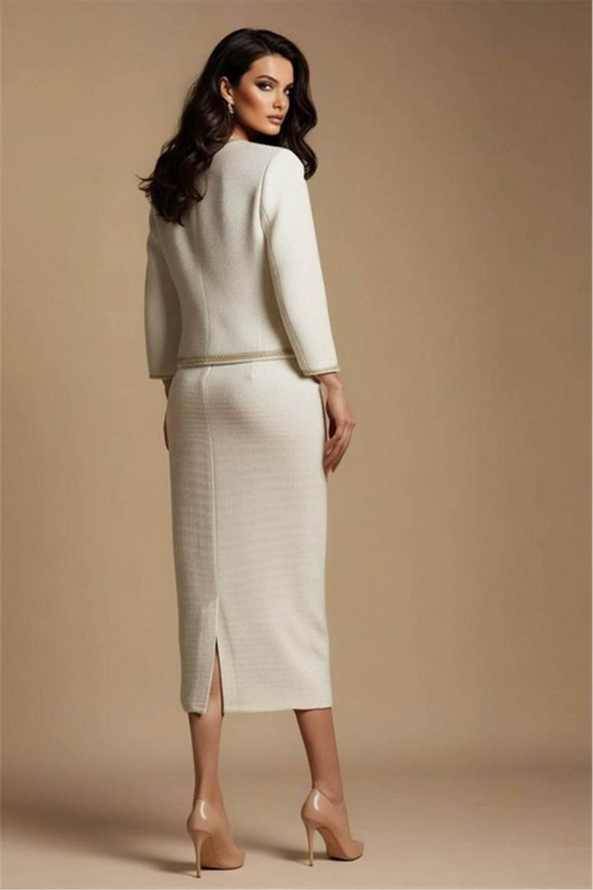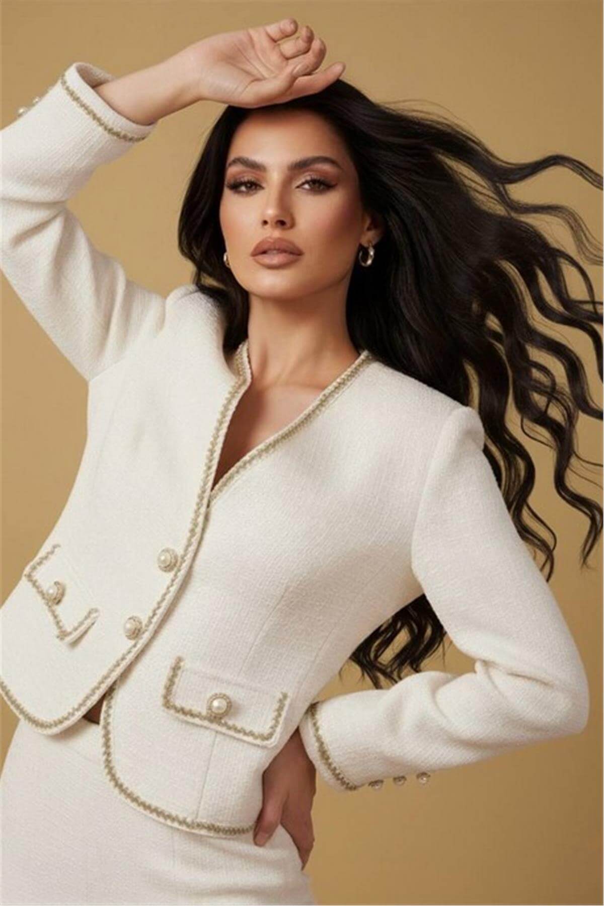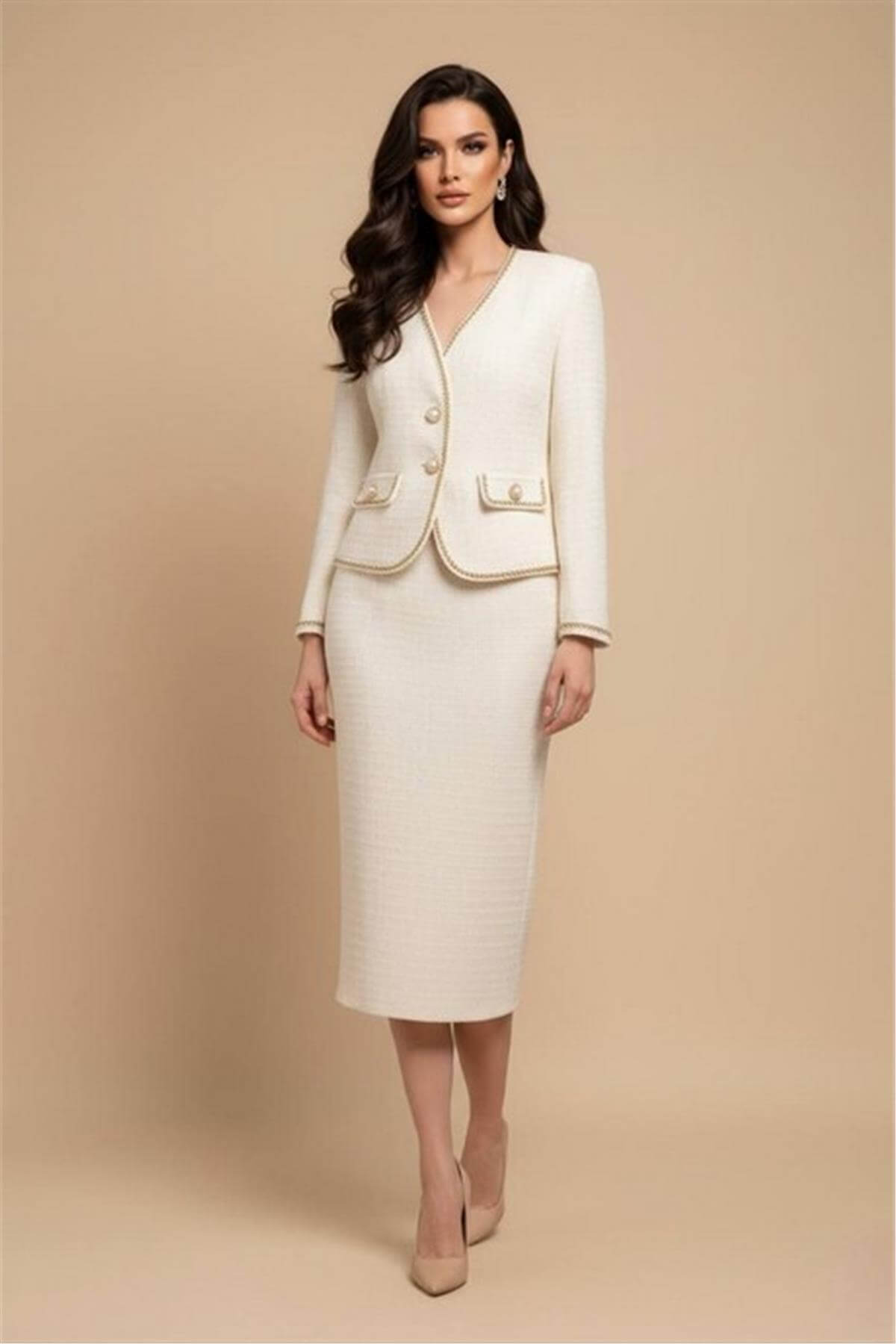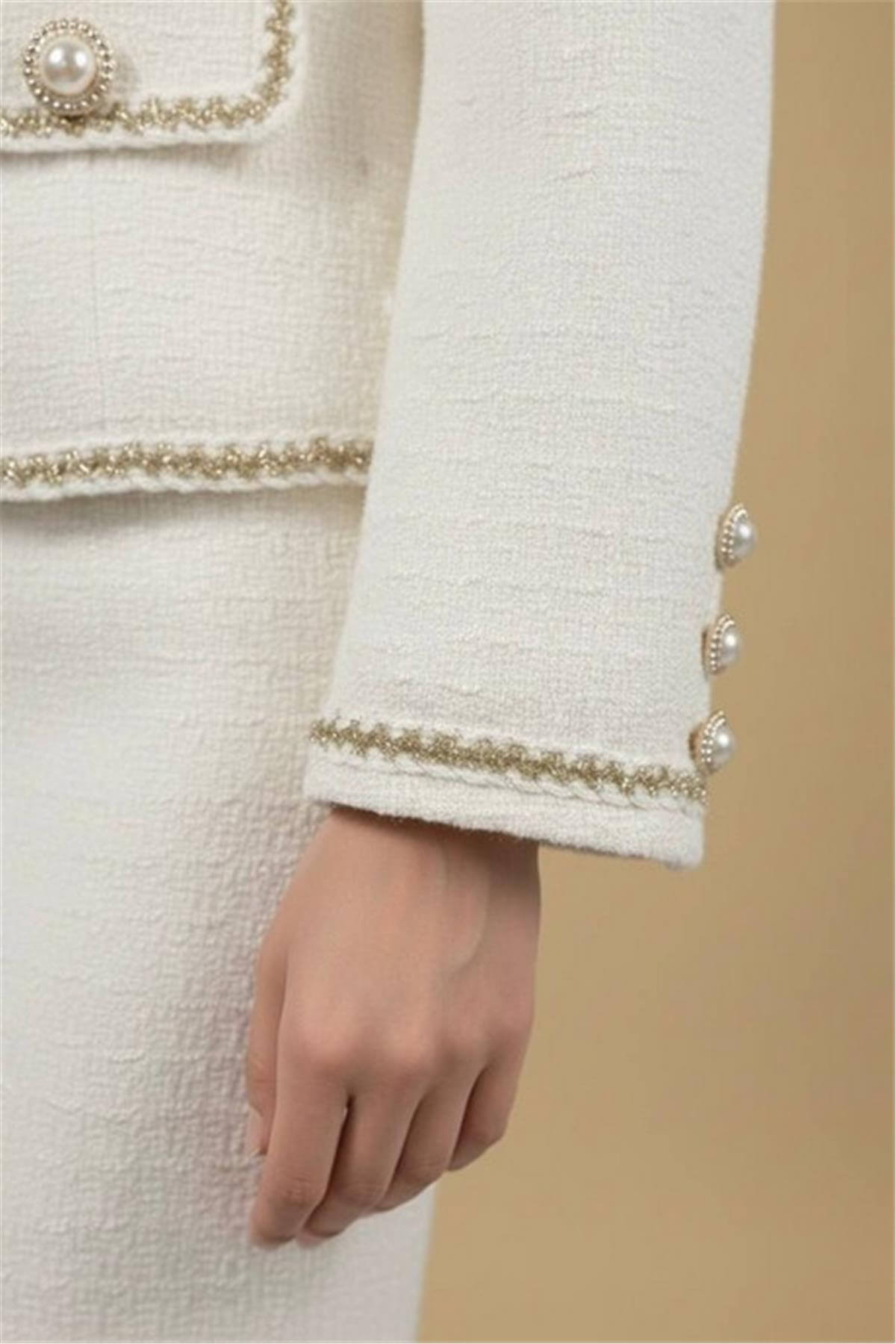 İnci Düğmeli Şeritli Beyaz Ceket Midi Boy Etek Takım