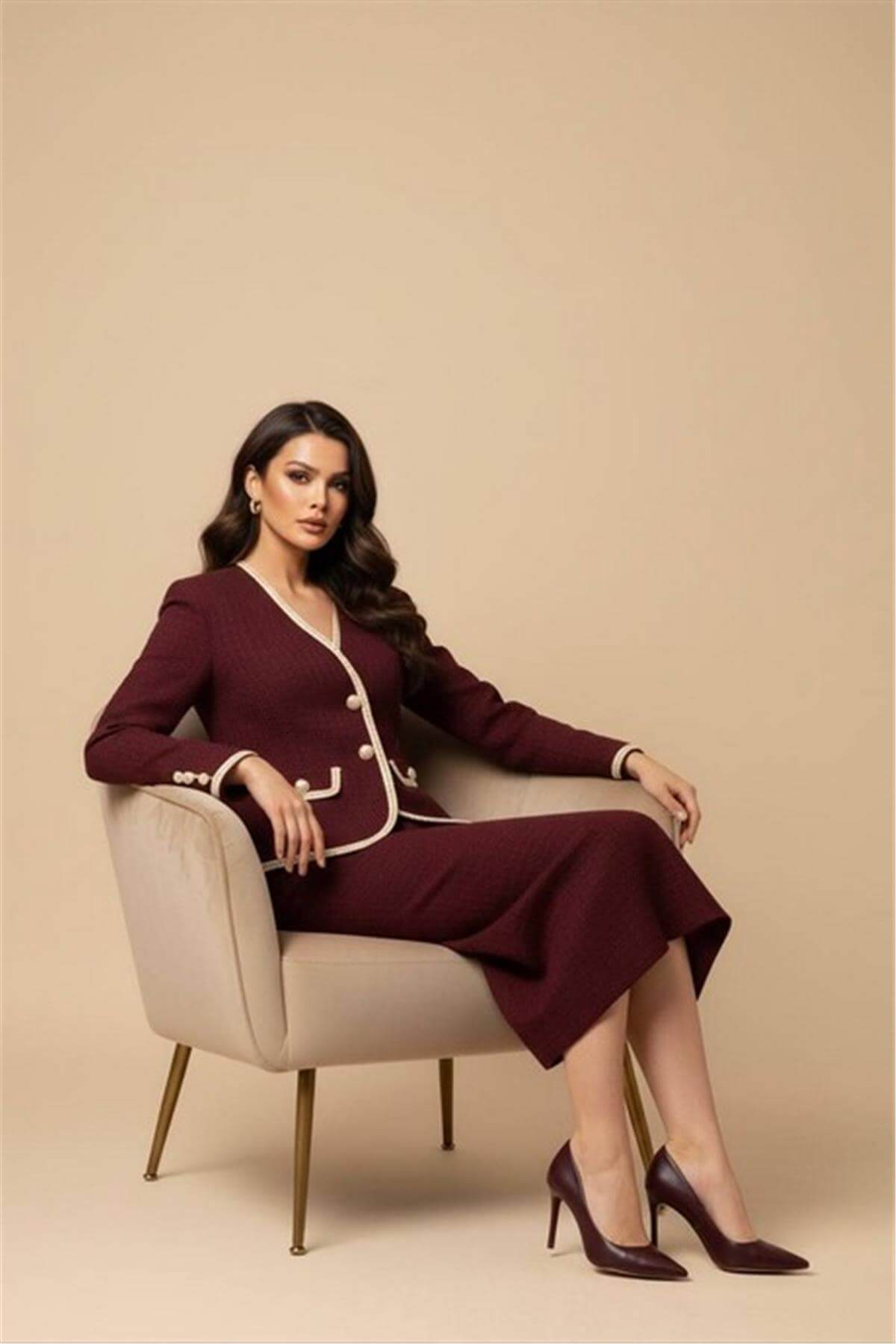 İnci Düğmeli Şeritli Bordo Ceket Midi Boy Etek Takım