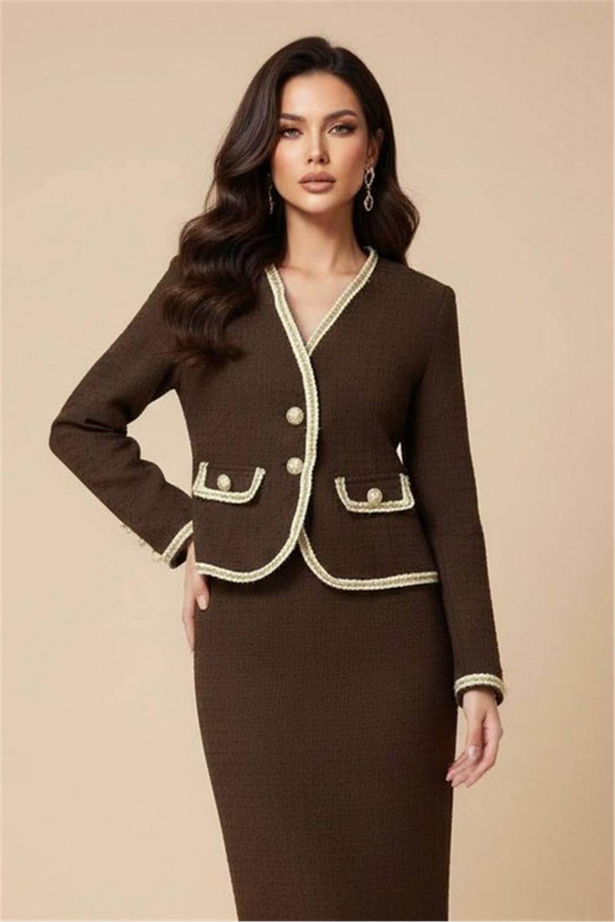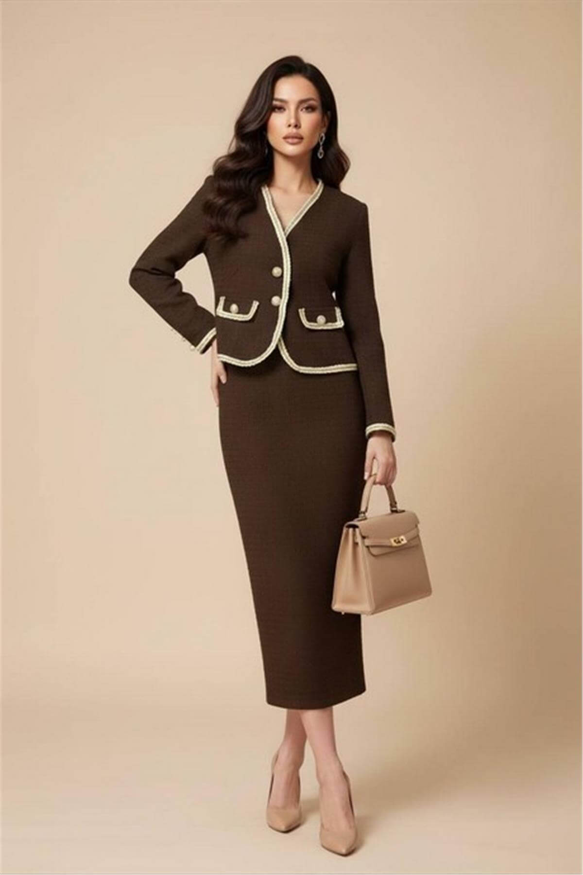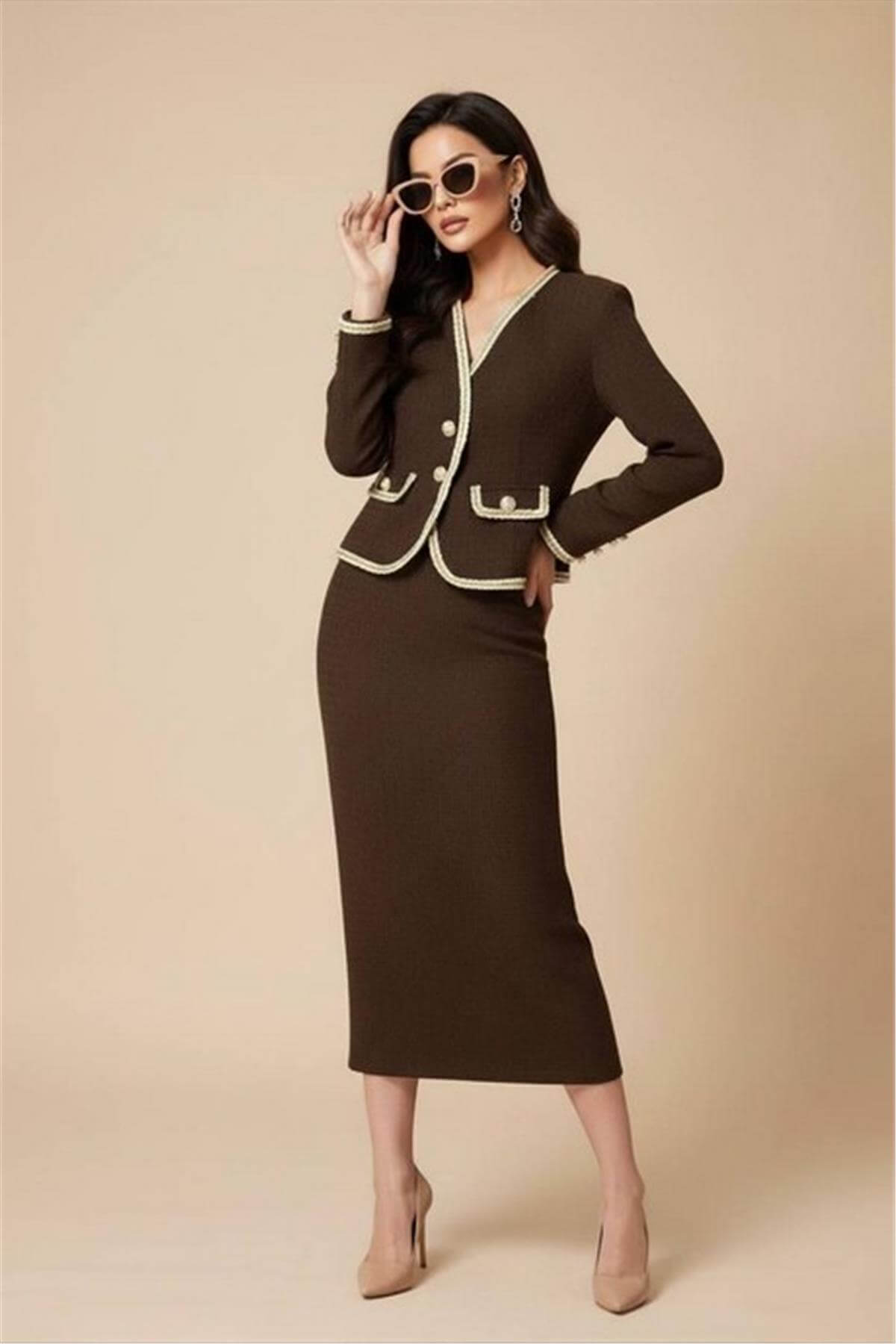 İnci Düğmeli Şeritli Kahverengi Ceket Midi Boy Etek Takım