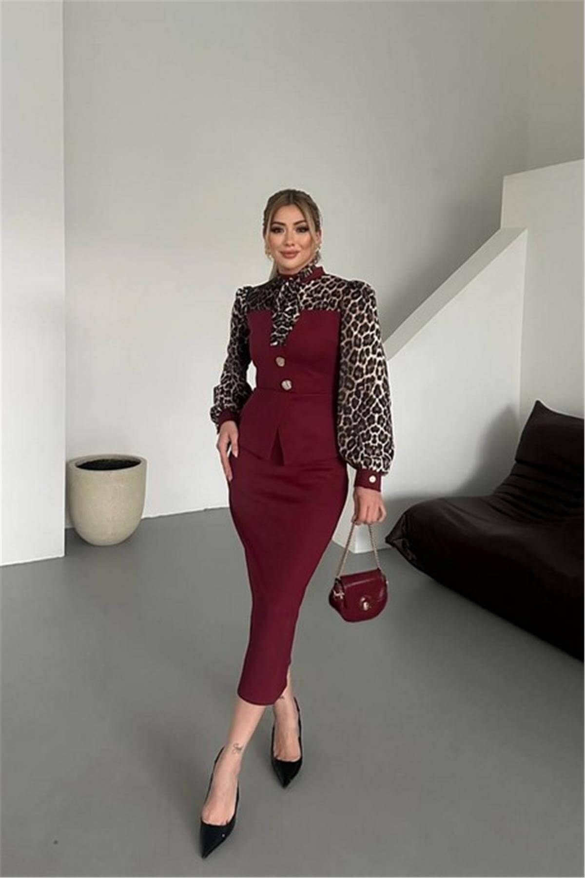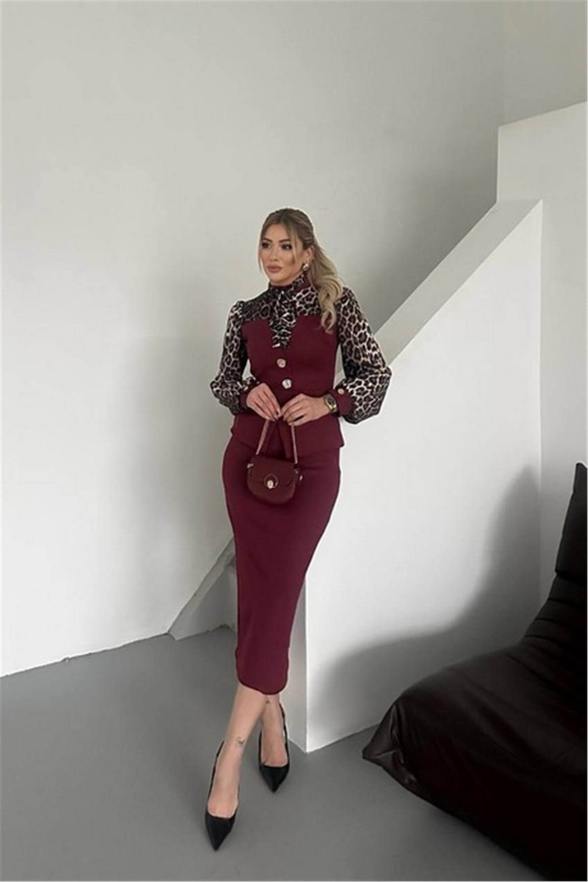 Leopar Detaylı Gömlek Midi Boy Etek Bordo Takım