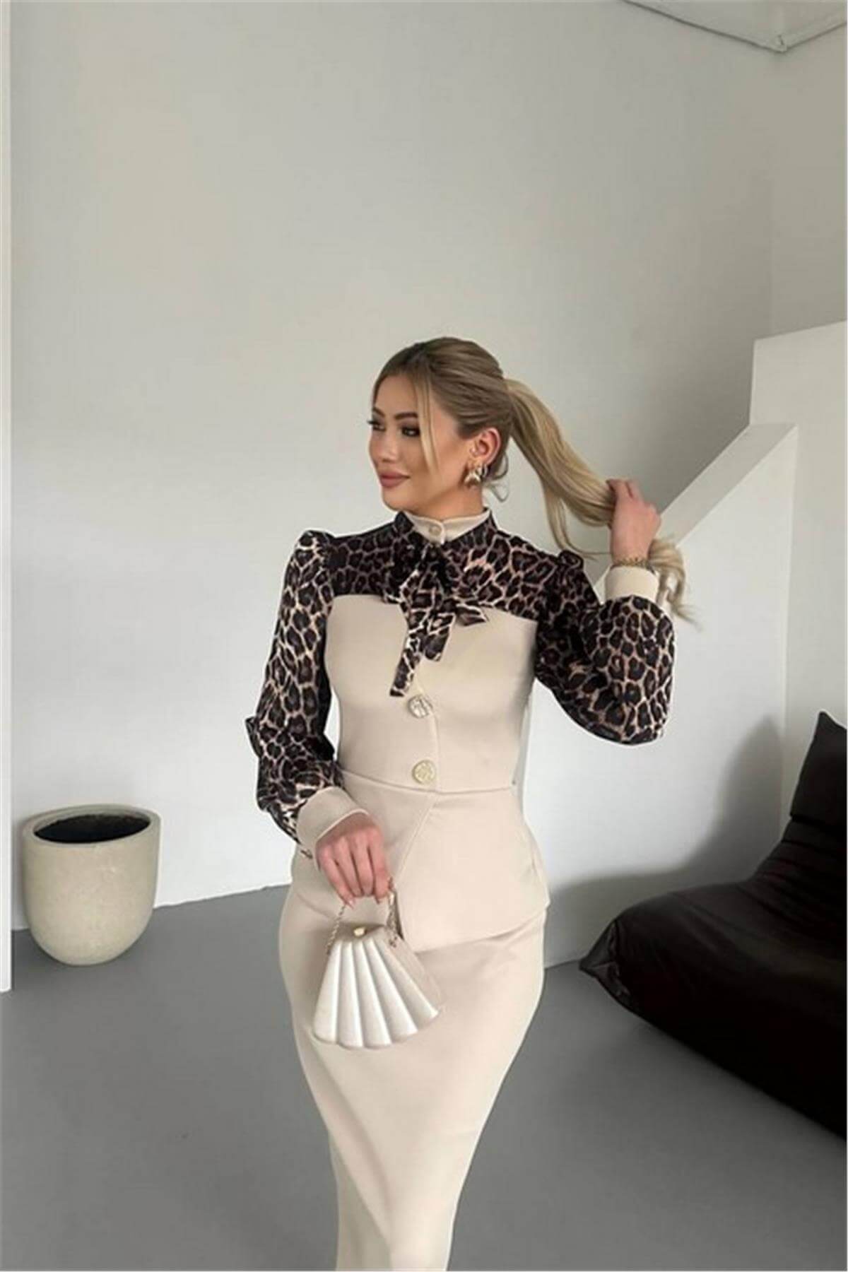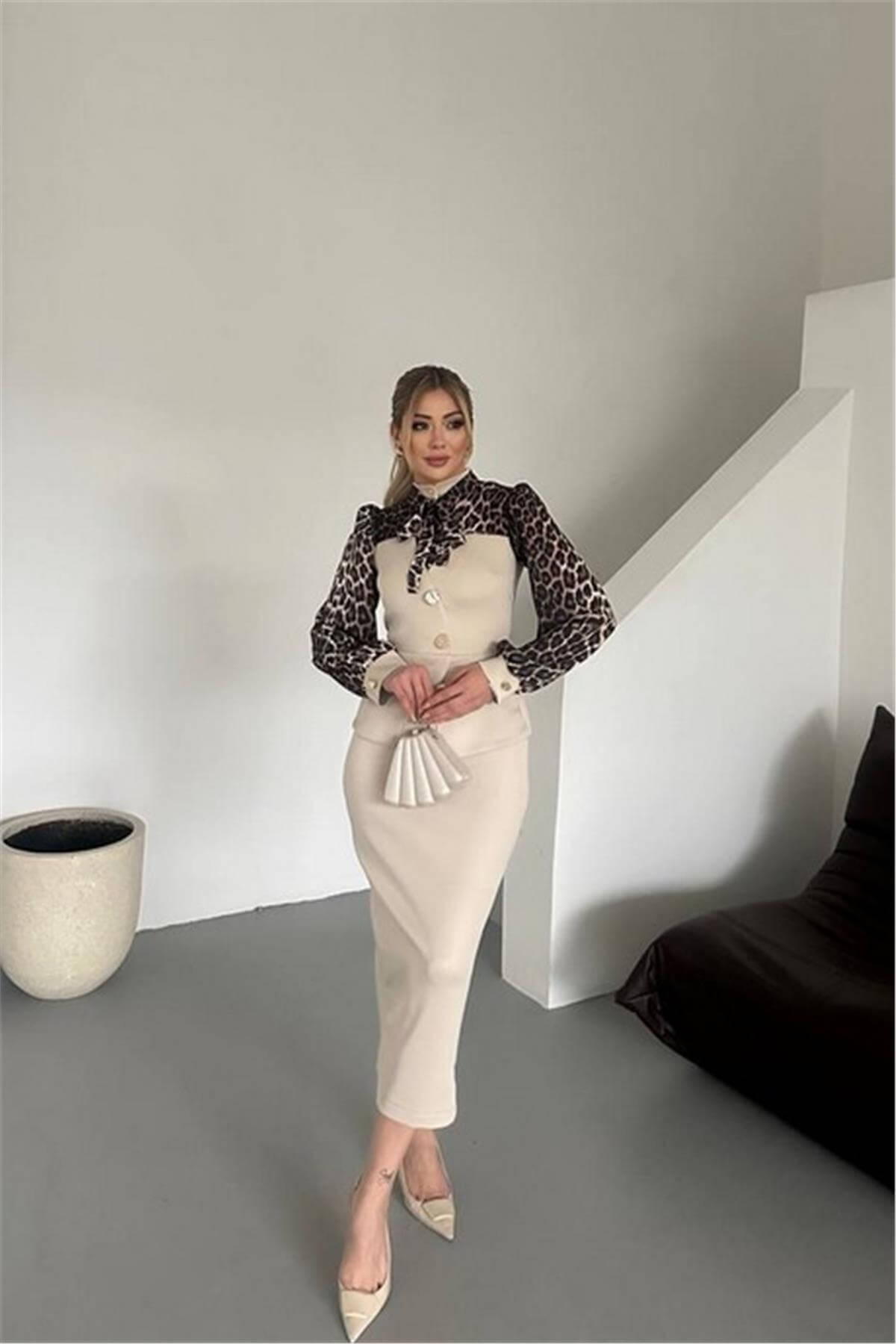 Leopar Detaylı Gömlek Midi Boy Etek Krem Takım