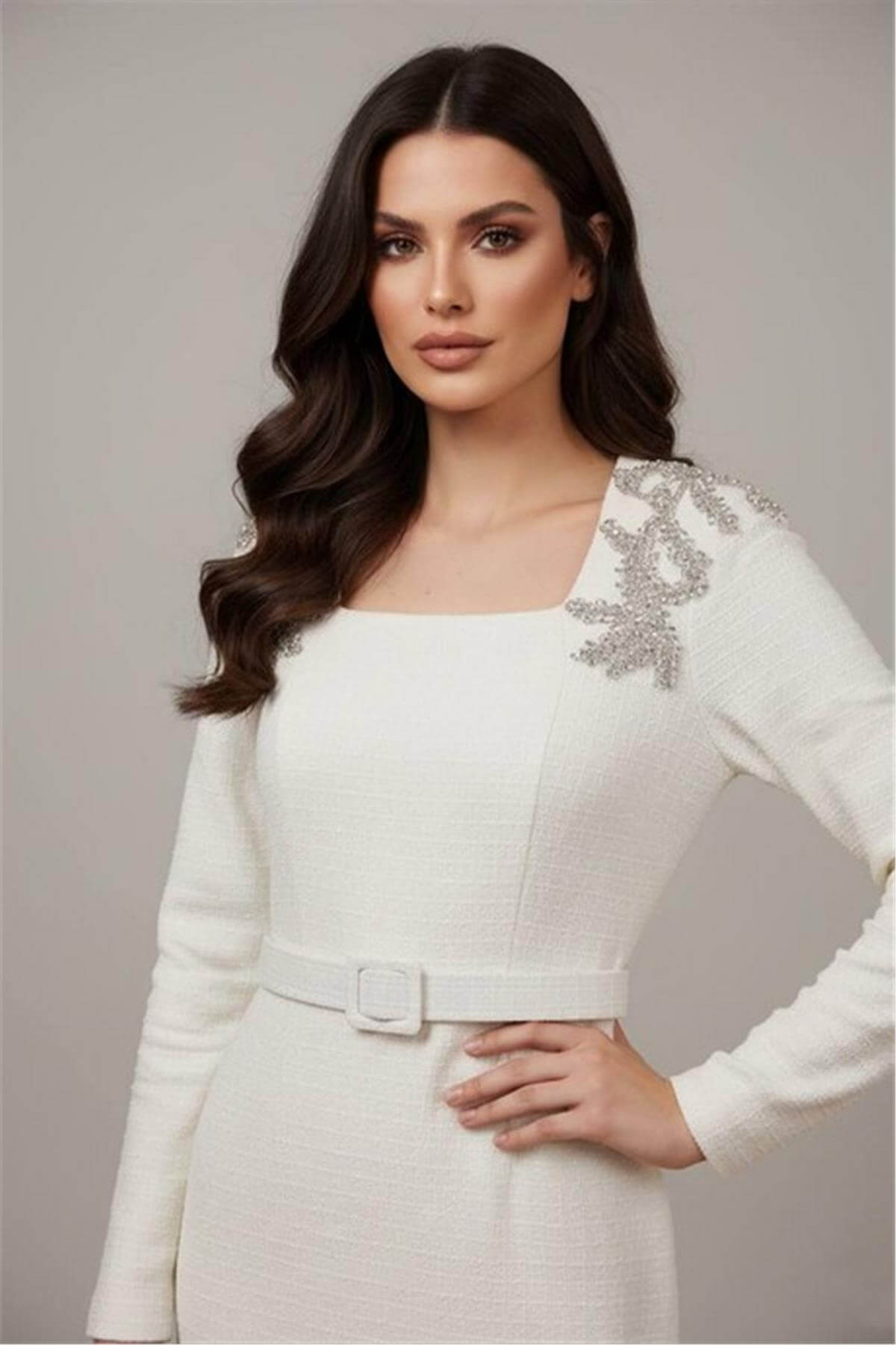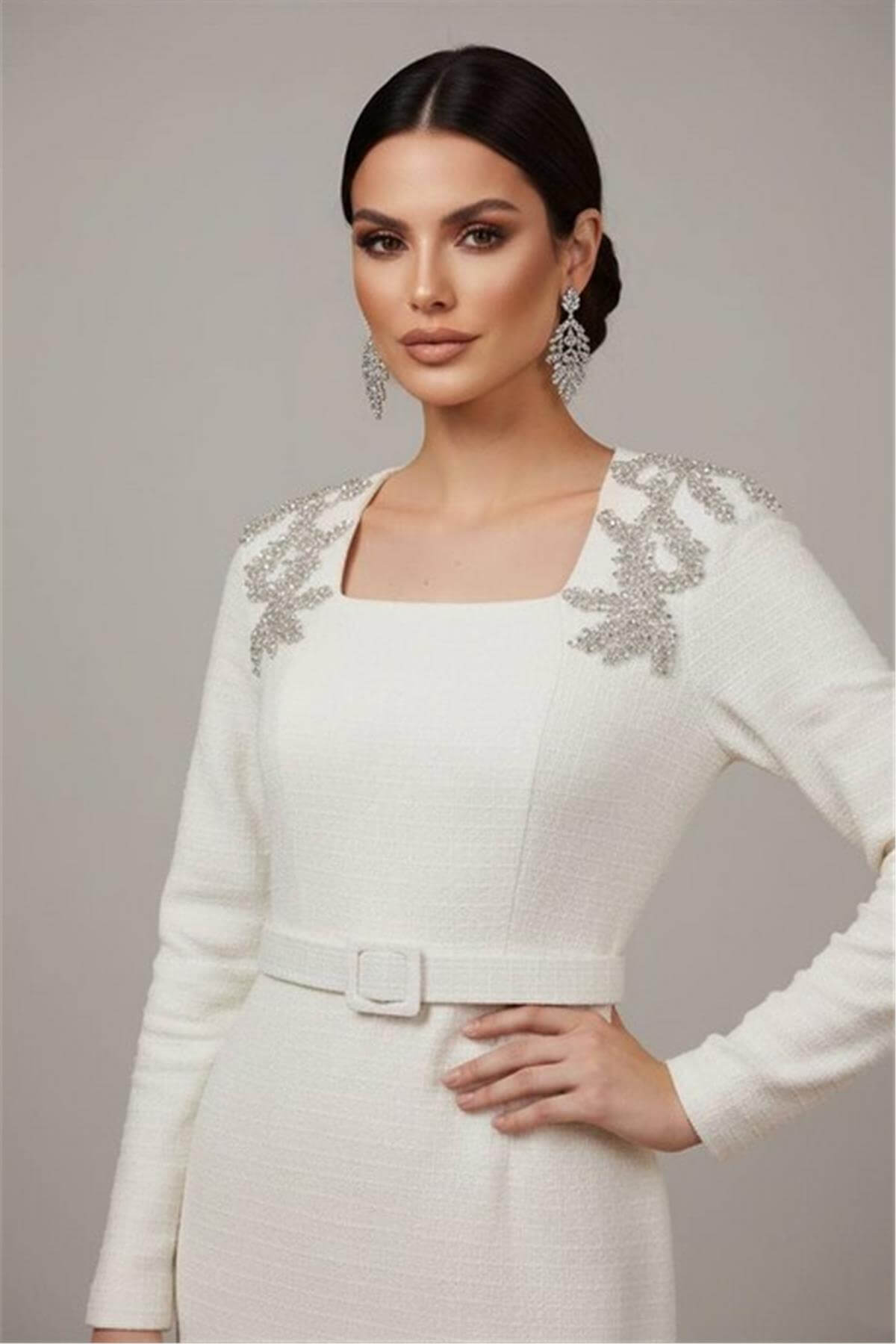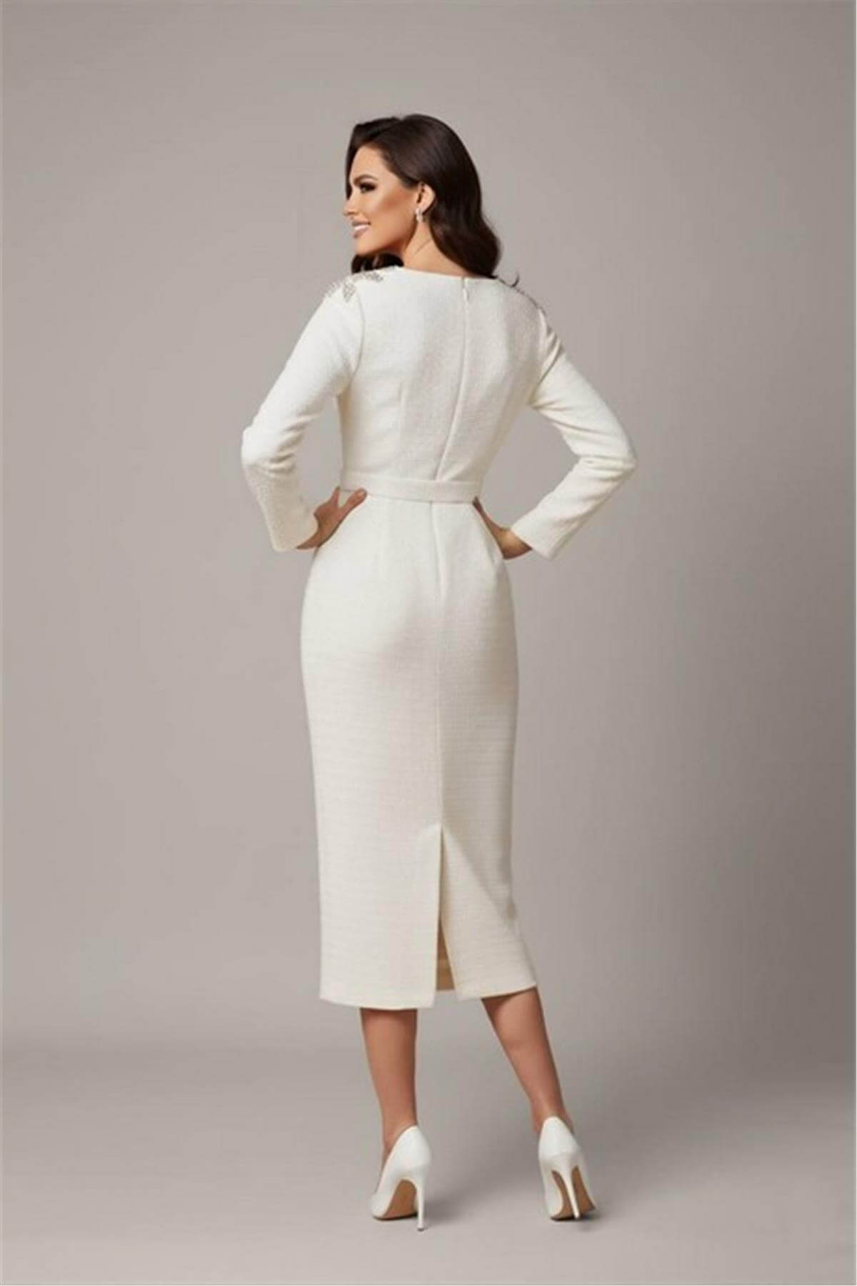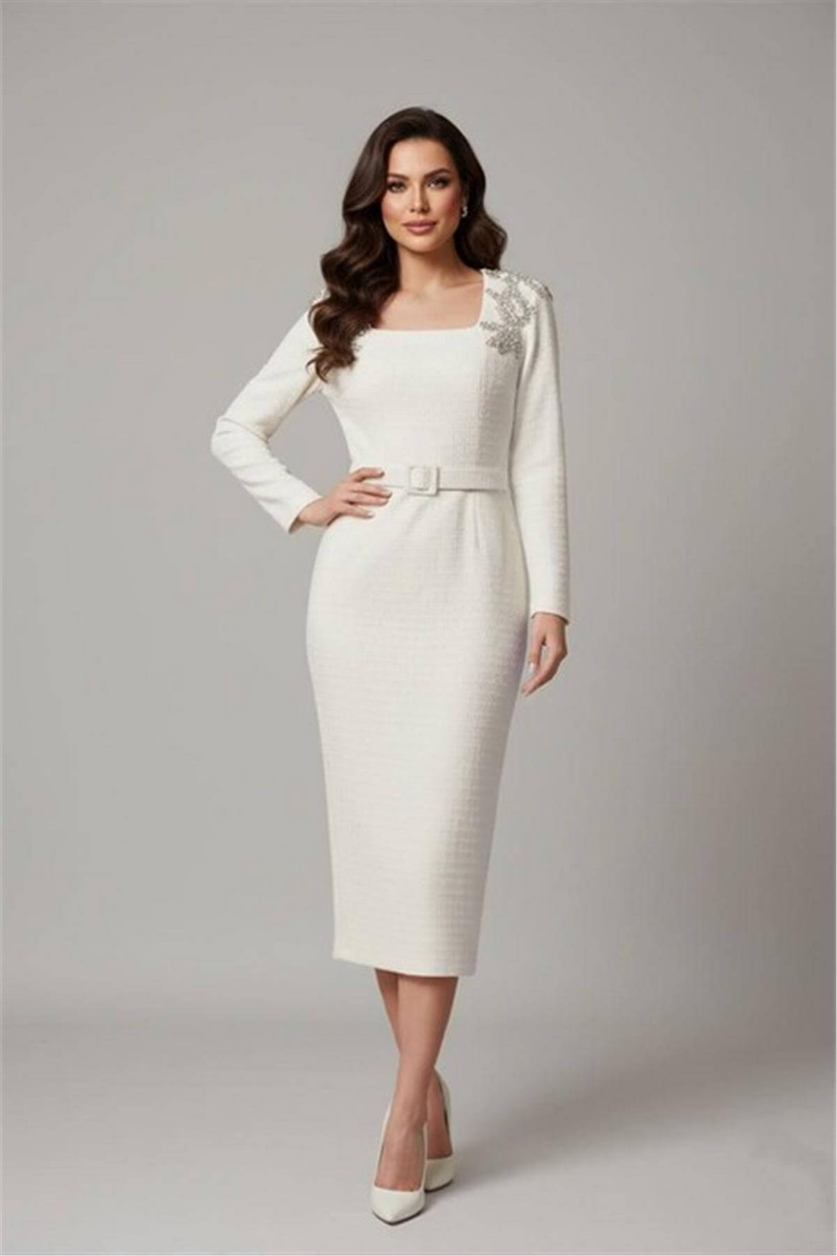 Omuz İşlemeli Uzun Kol Kemer Detaylı Midi Boy Beyaz Elbise