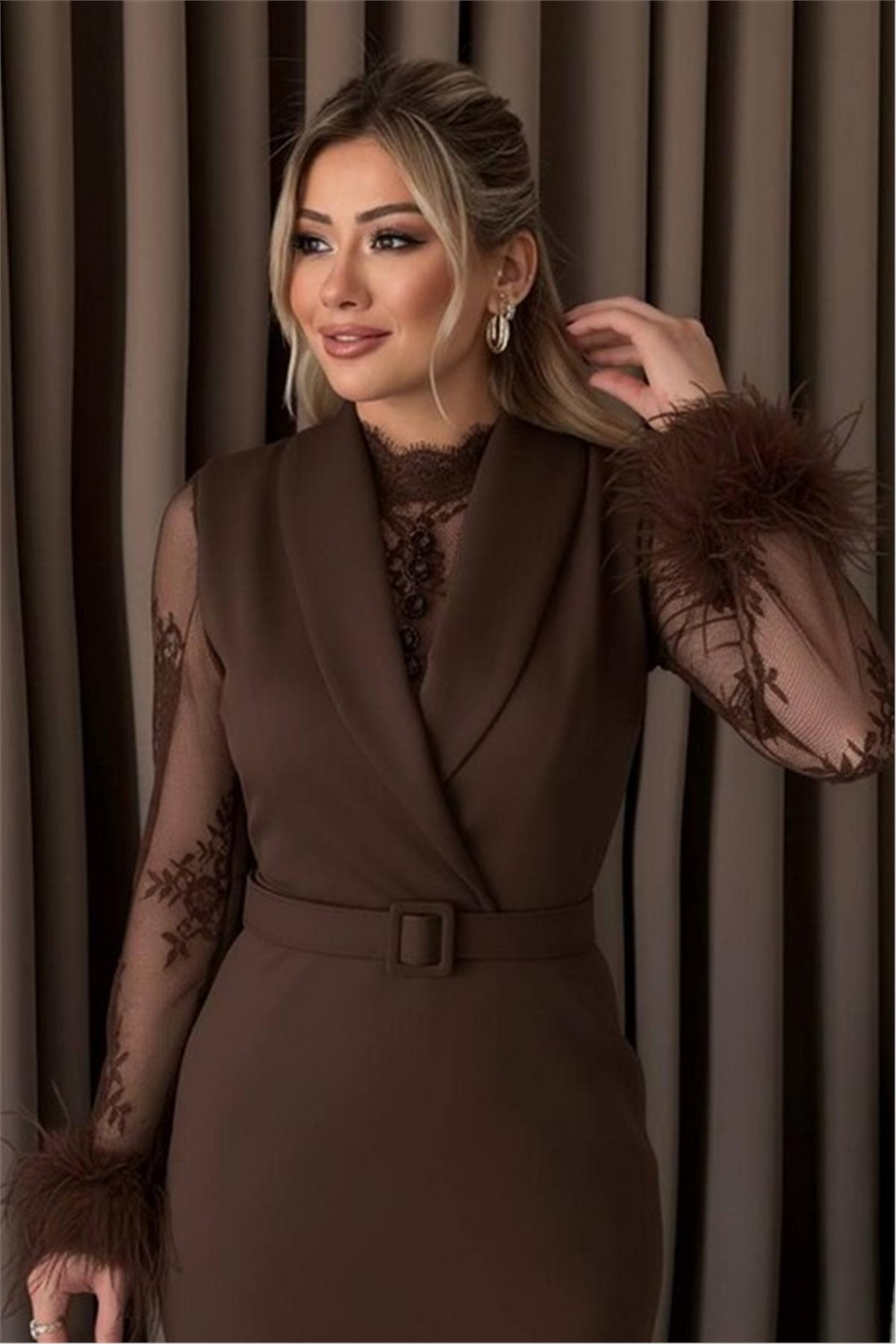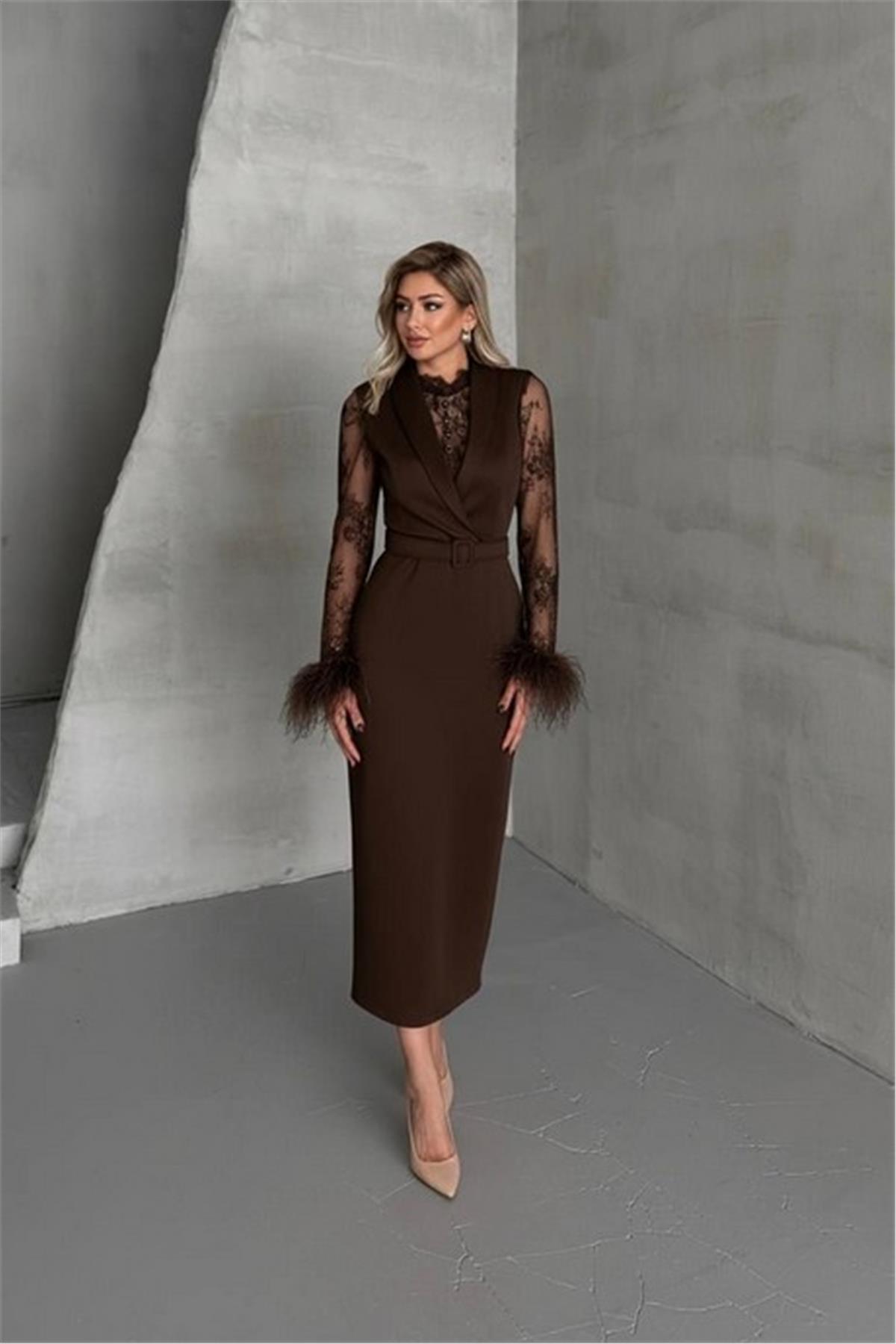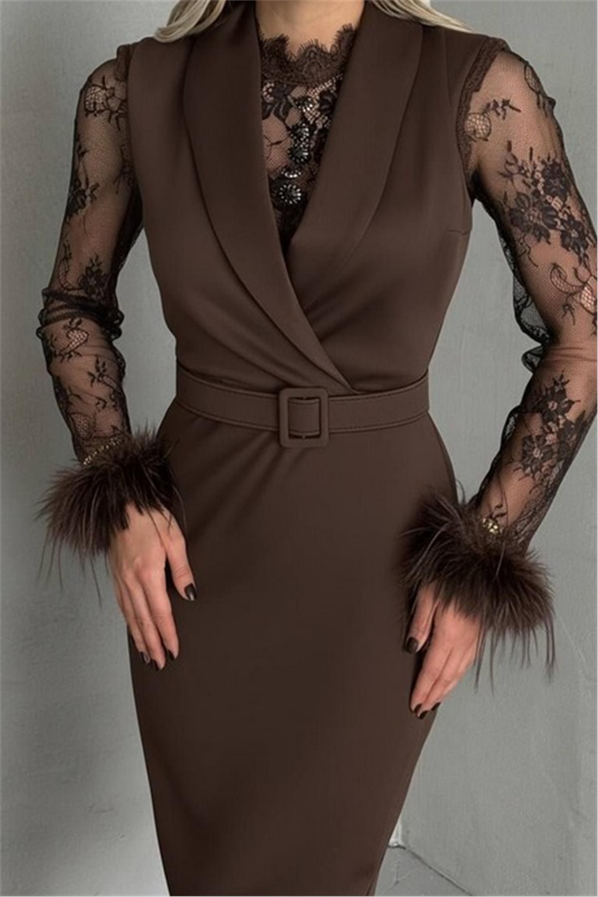 Tül Detaylı Kollar Tüylü Midi Boy Kahverengi Elbise