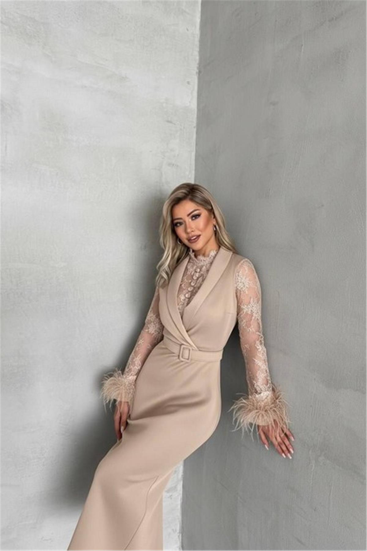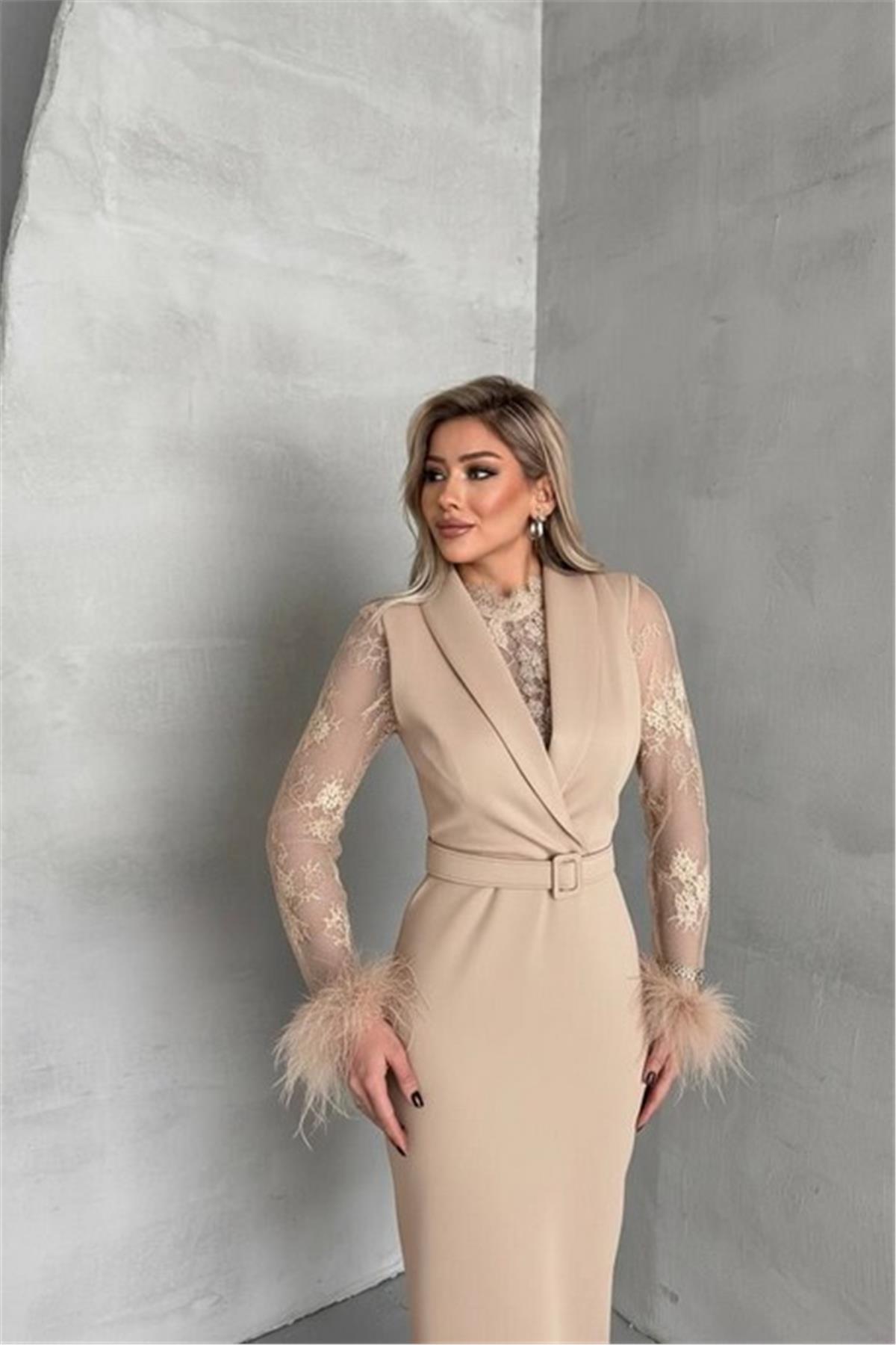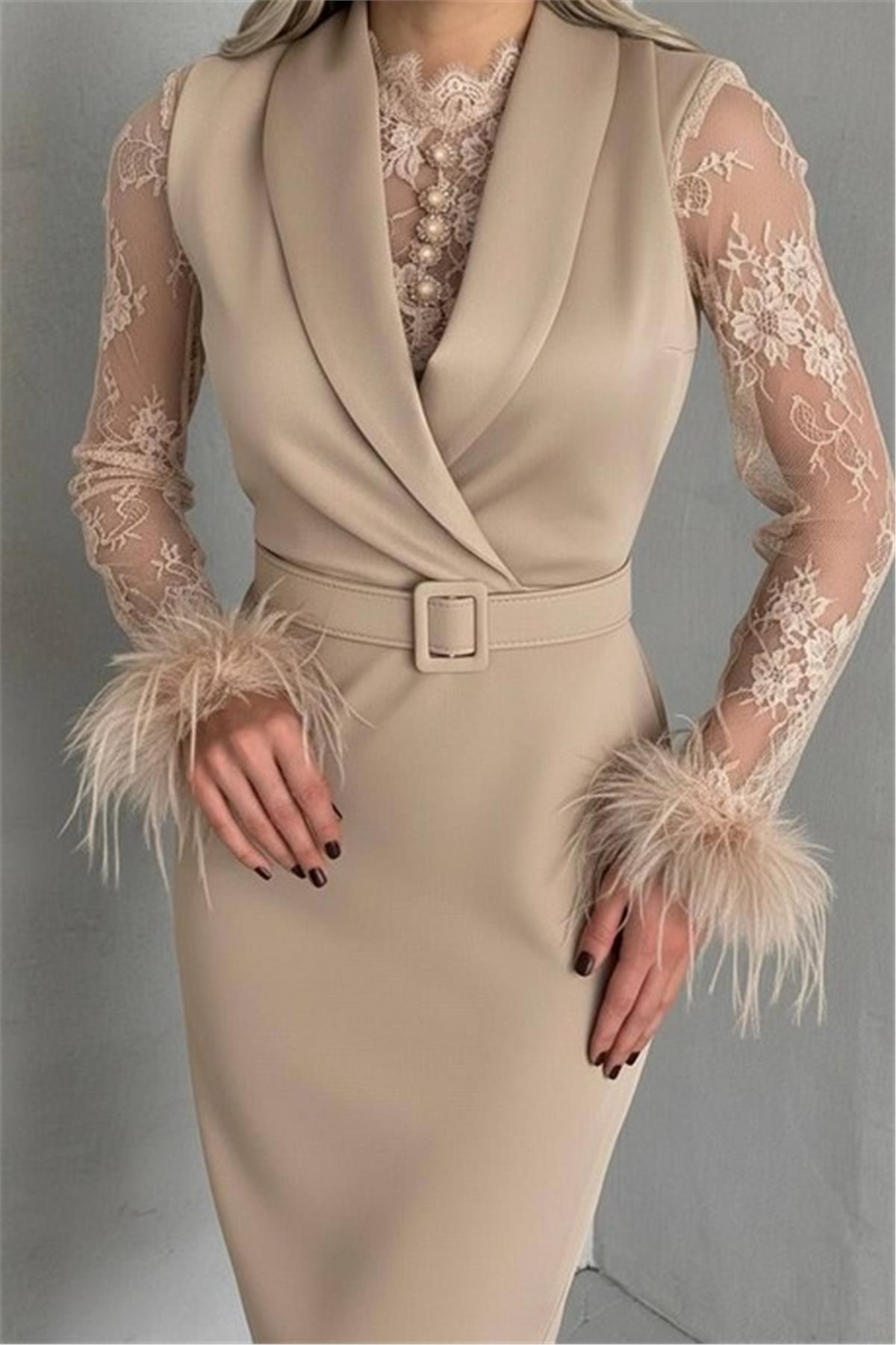 Tül Detaylı Kollar Tüylü Midi Boy Krem Elbise