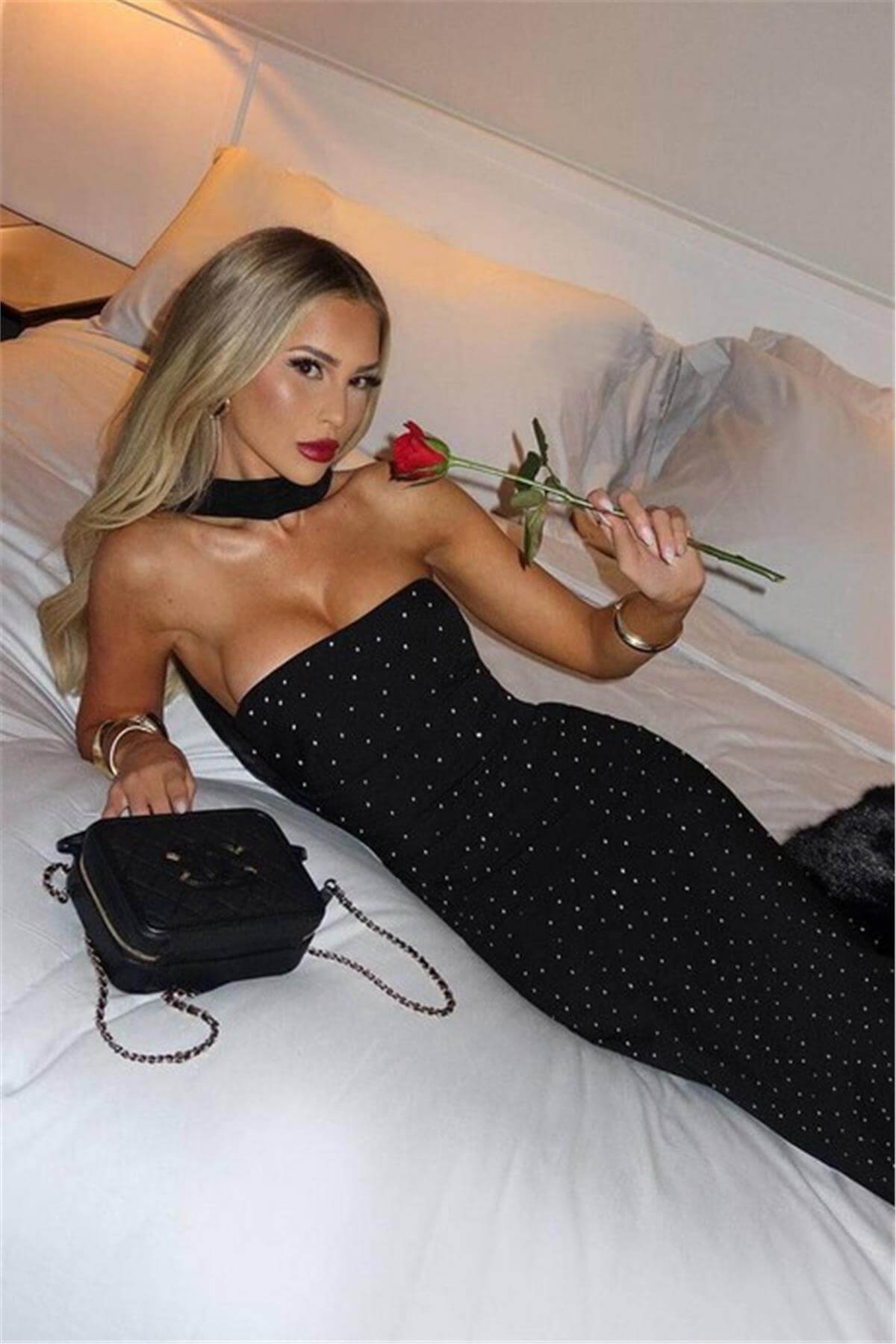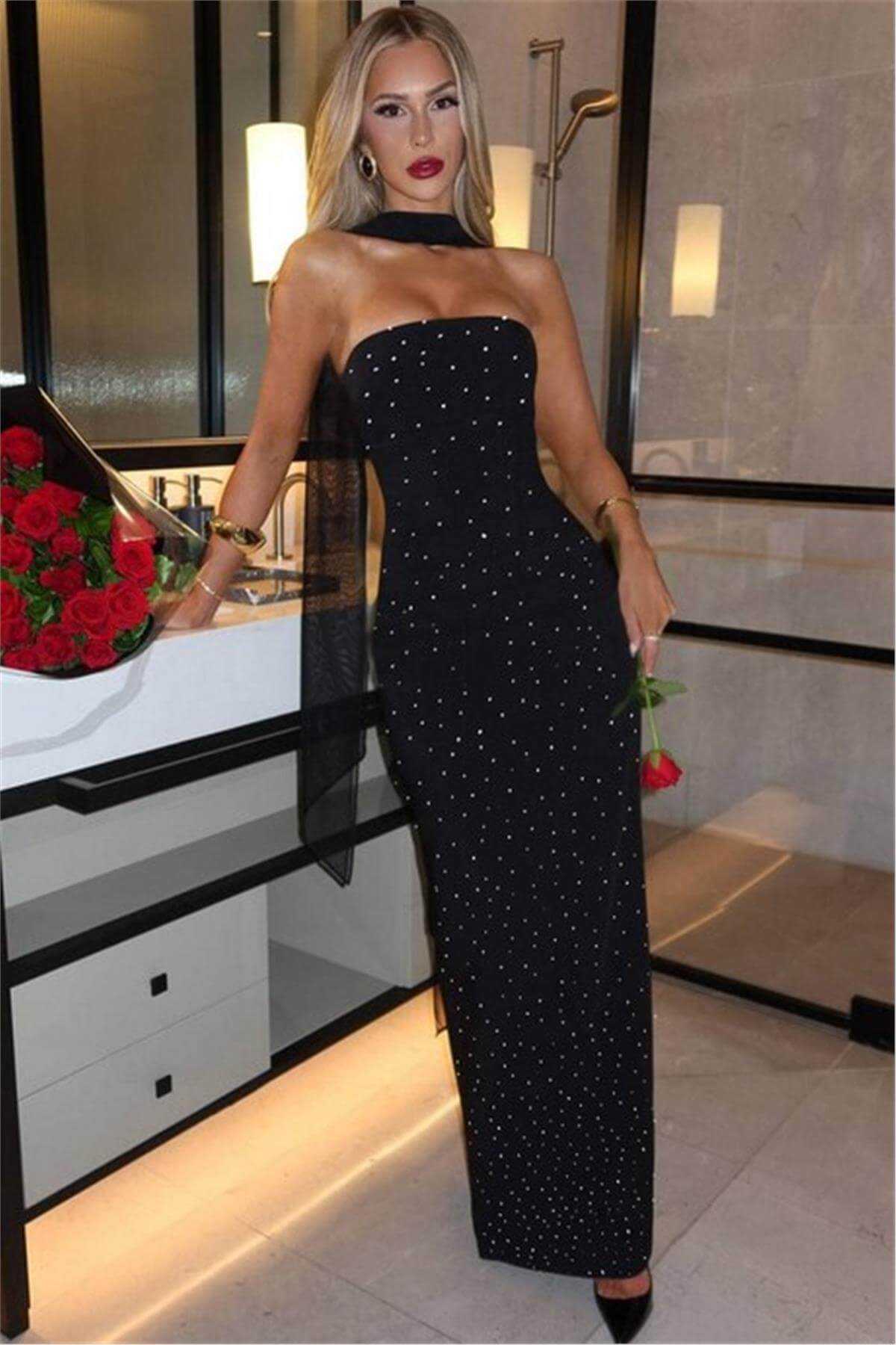 Tül Detaylı Straplez Taşlı Uzun Siyah Elbise