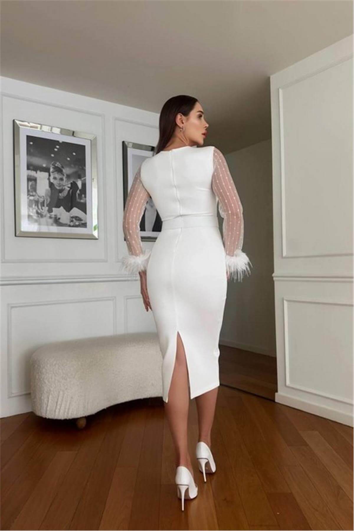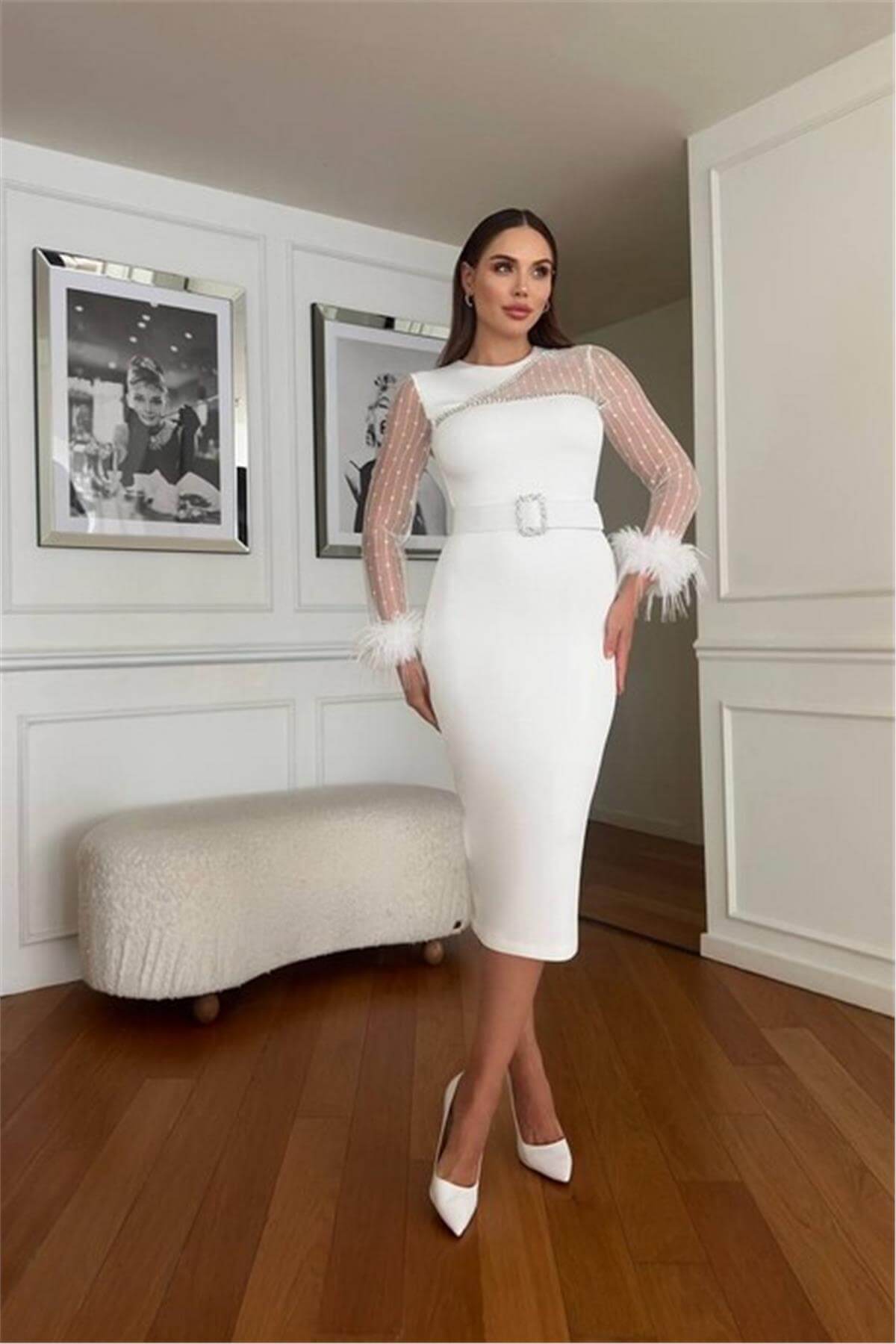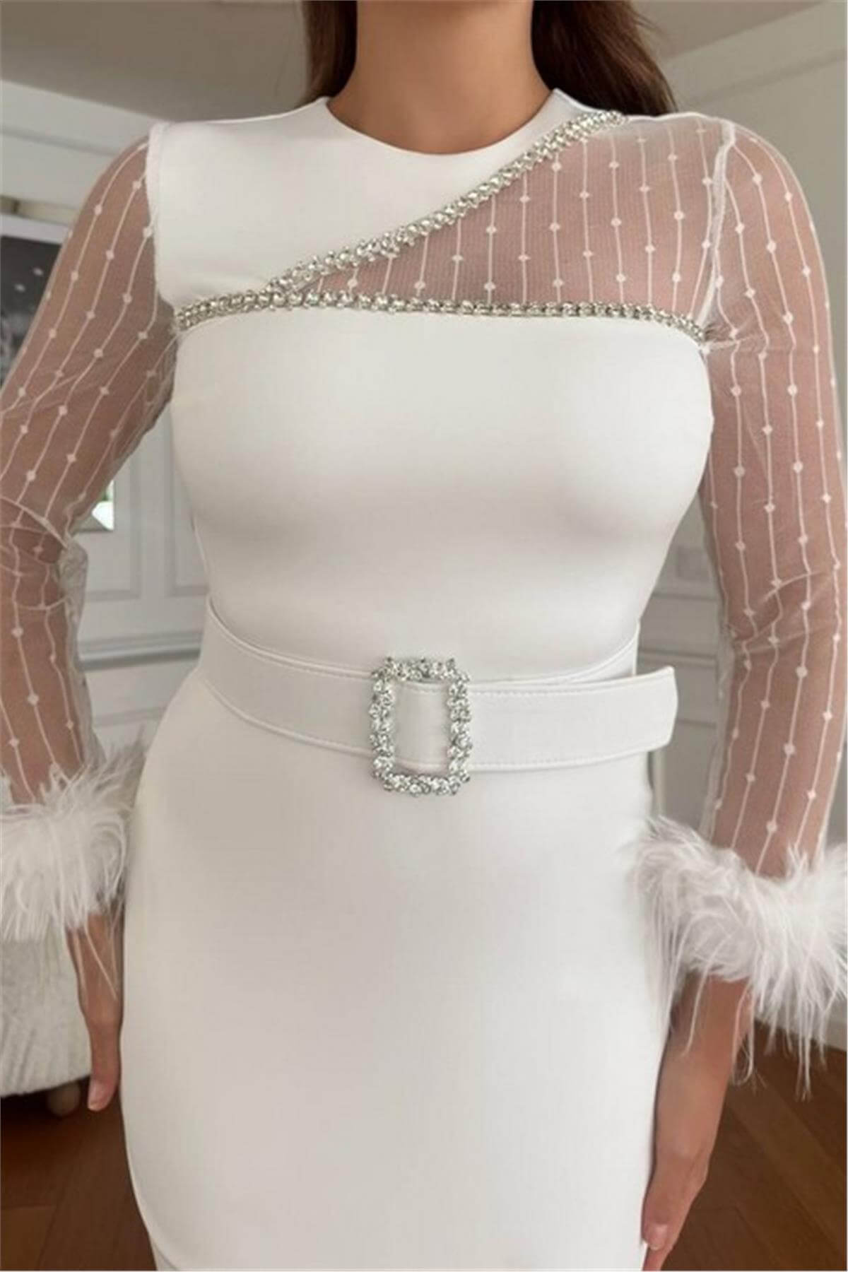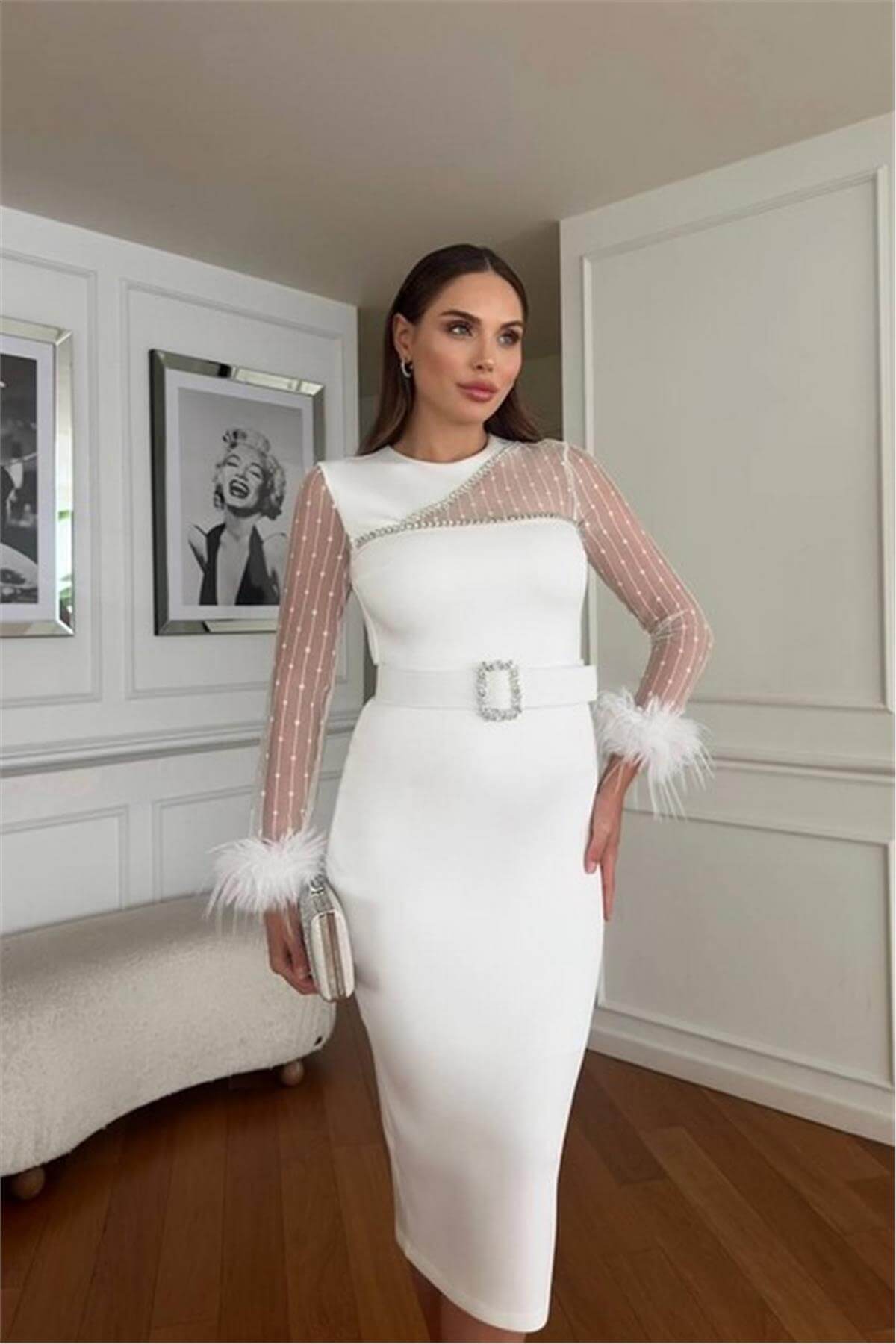 Tül Kollar Tüy Detaylı Kemerli Midi Boy Beyaz Elbise