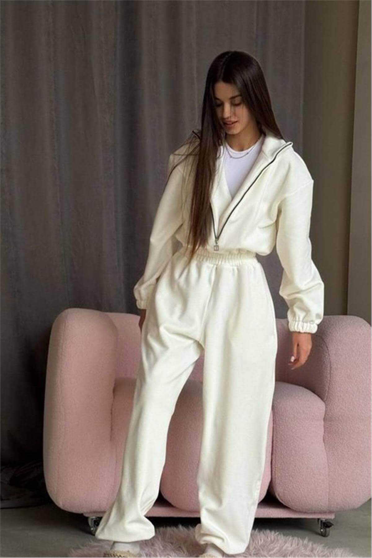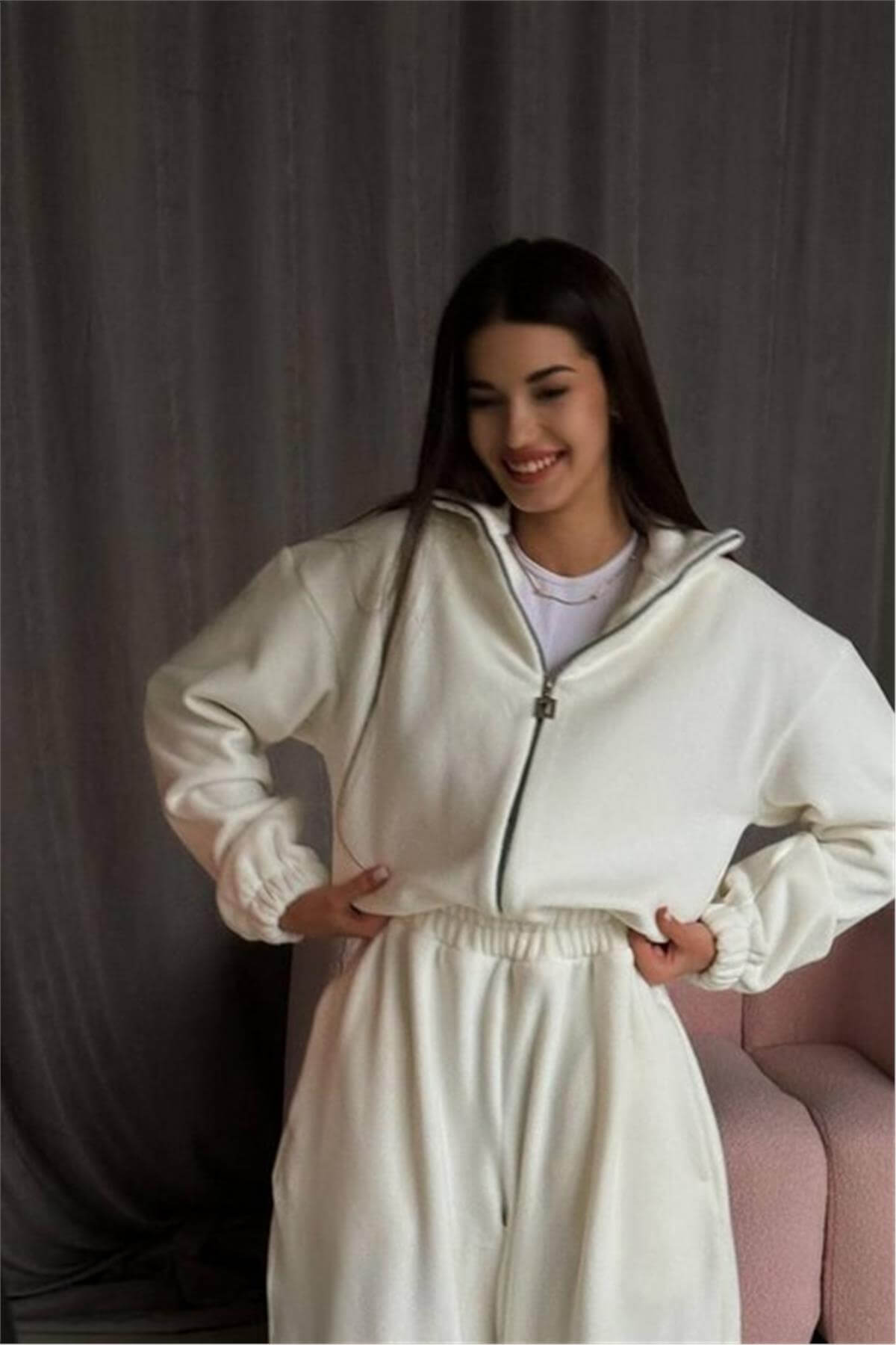 Fermuarlı Paça Lastikli Beyaz Eşofman Takımı