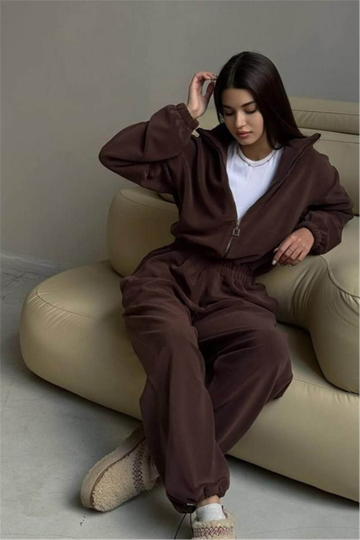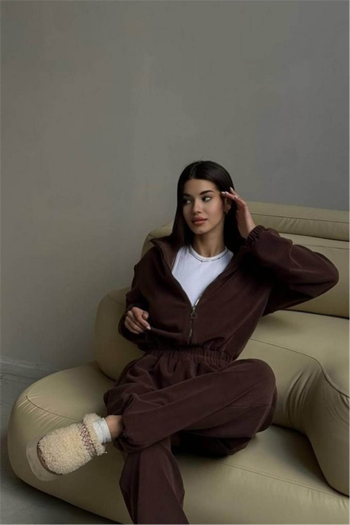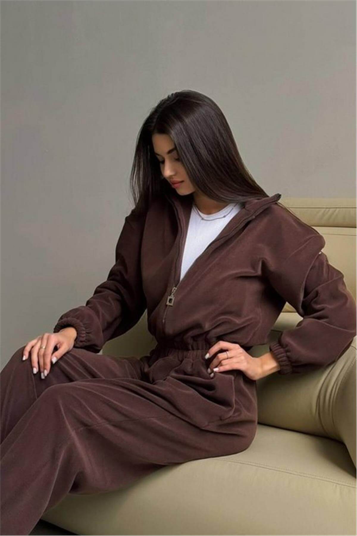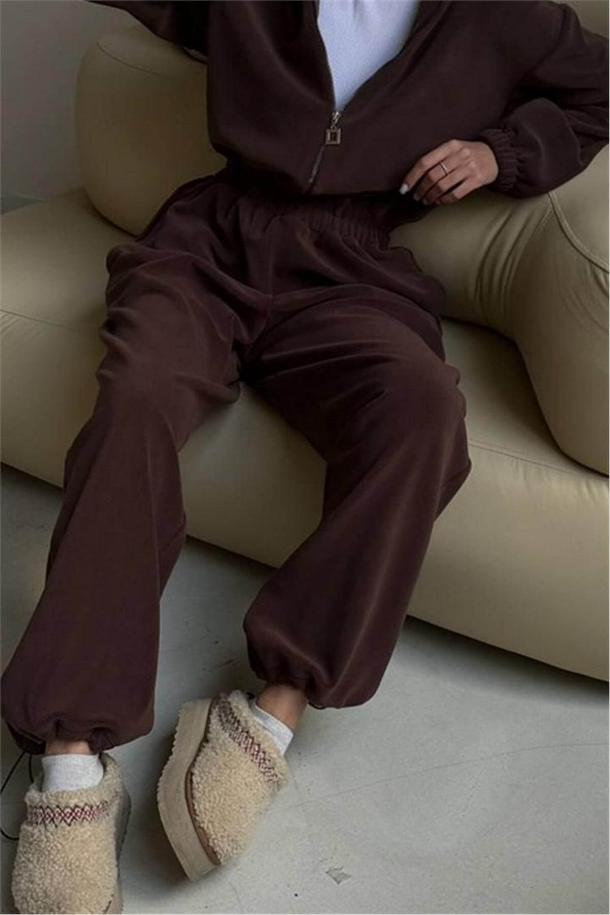 Fermuarlı Paça Lastikli Kahve Eşofman Takımı