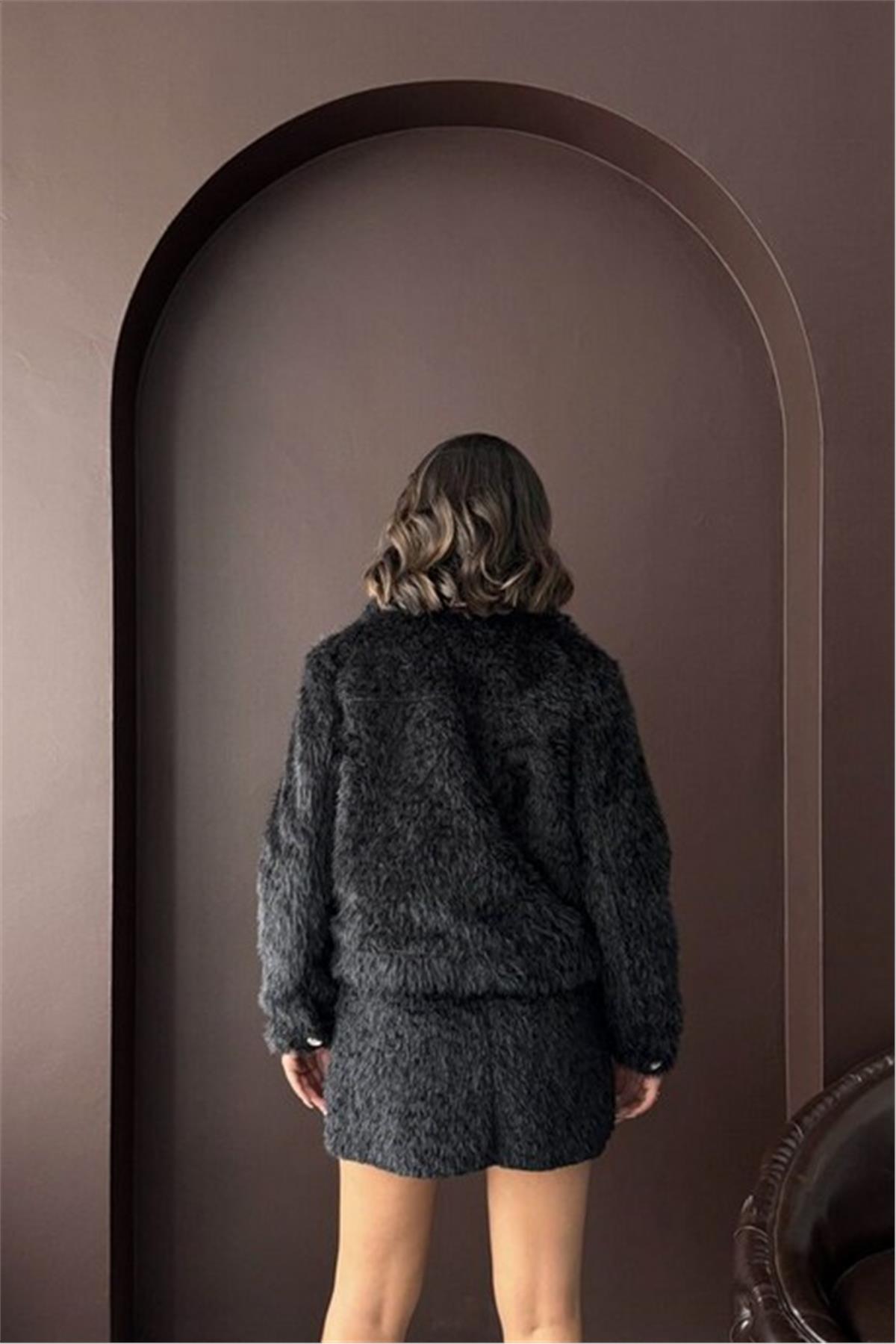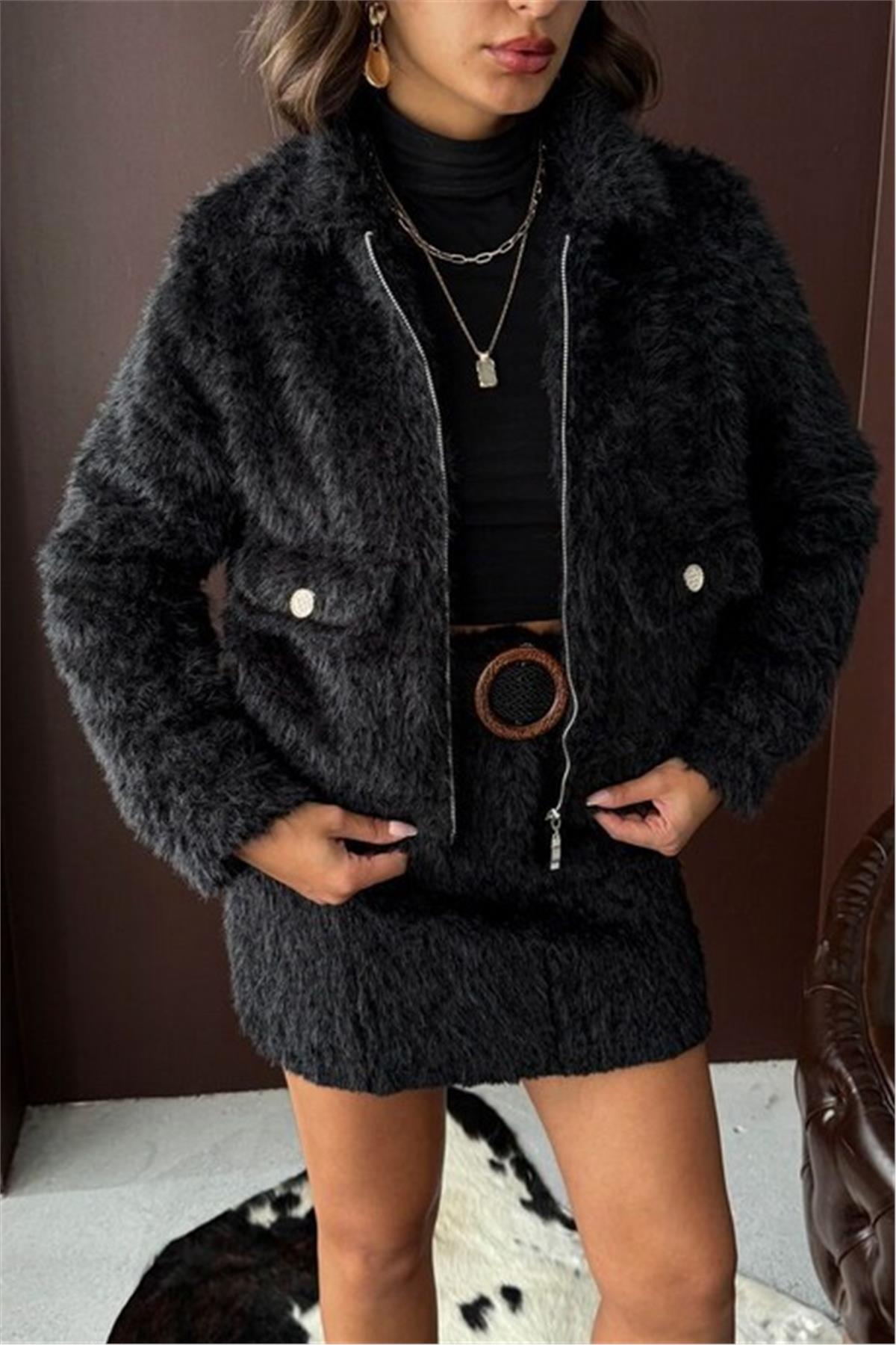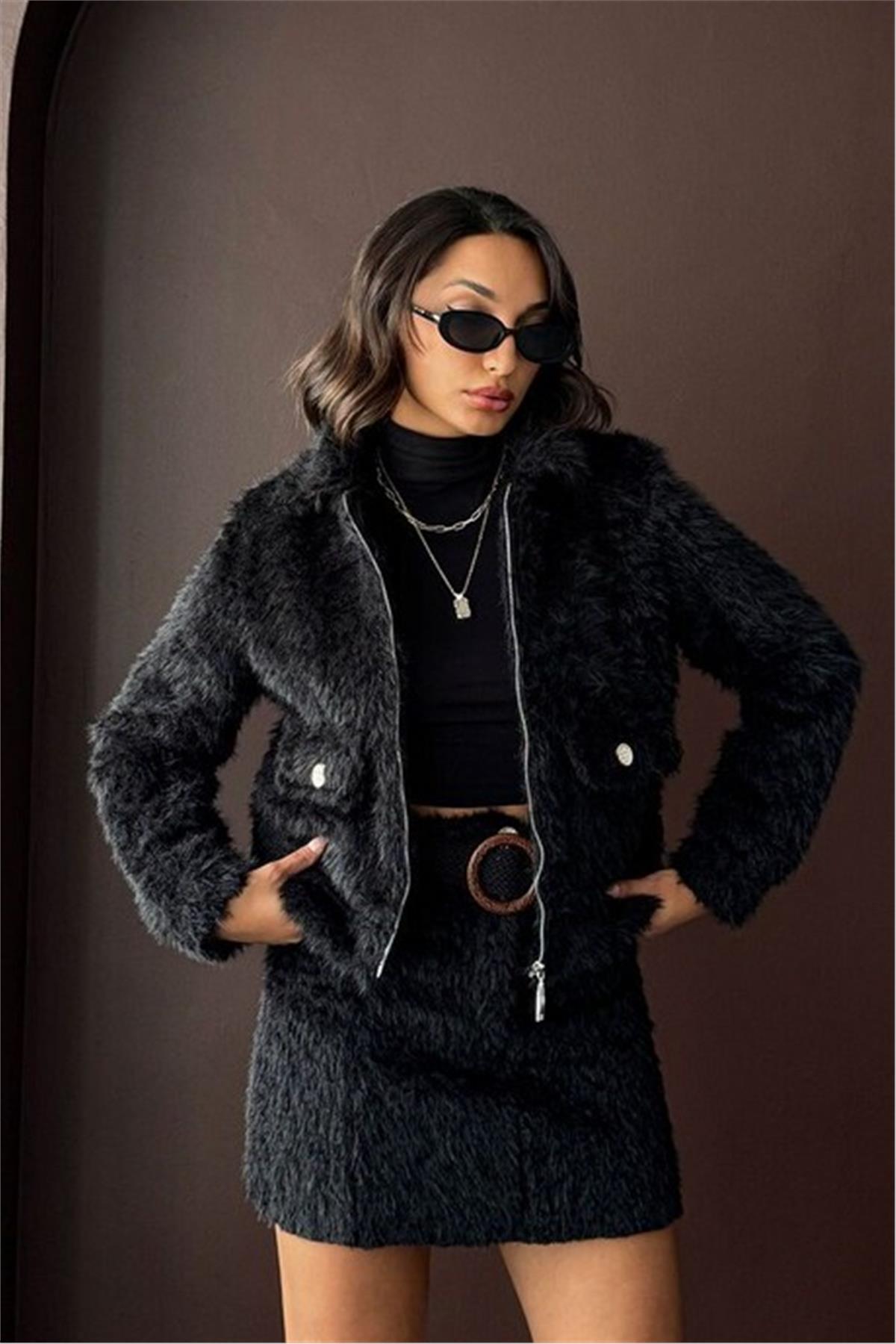 Fermuarlı Siyah Kürk Ceket