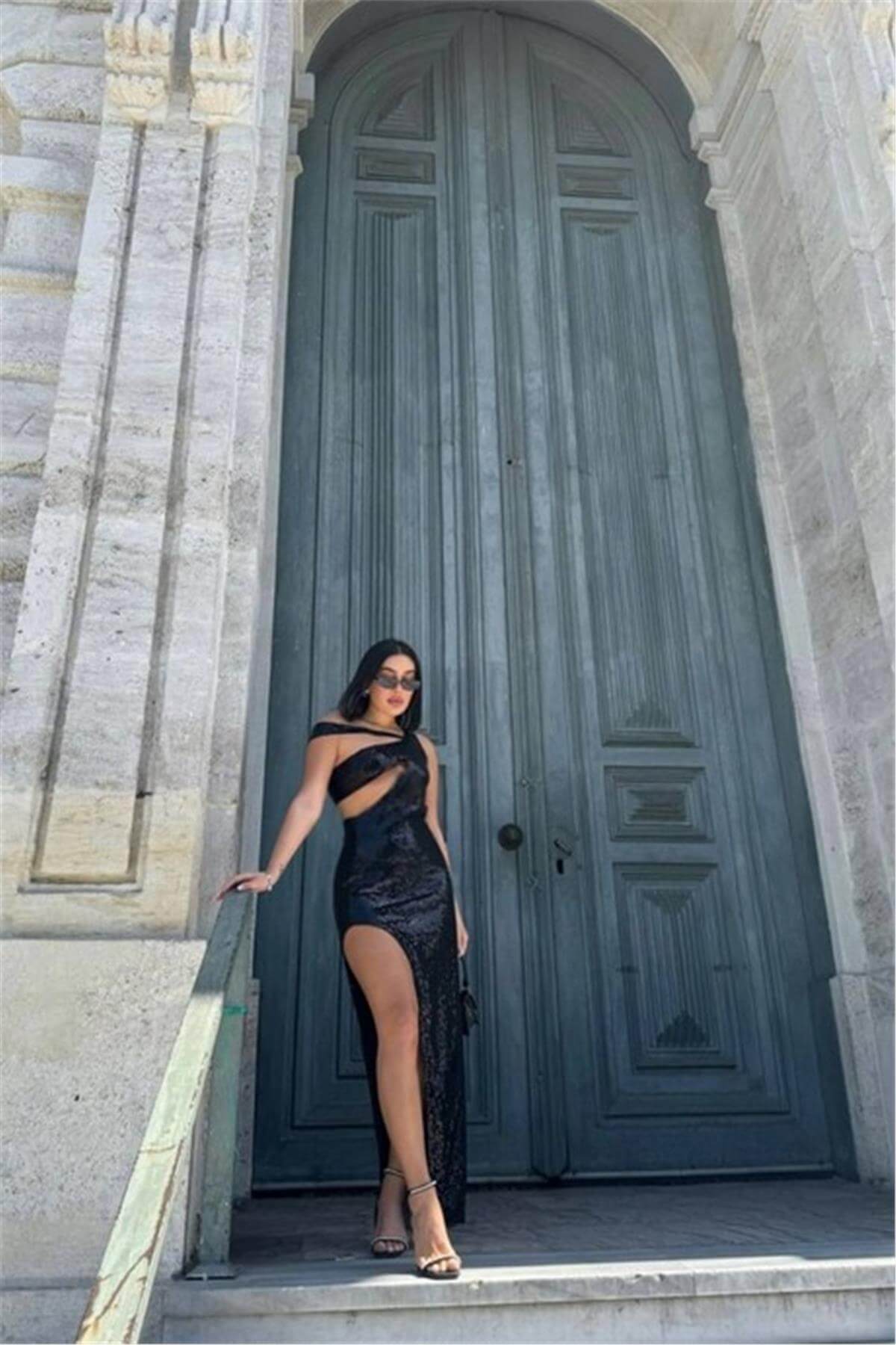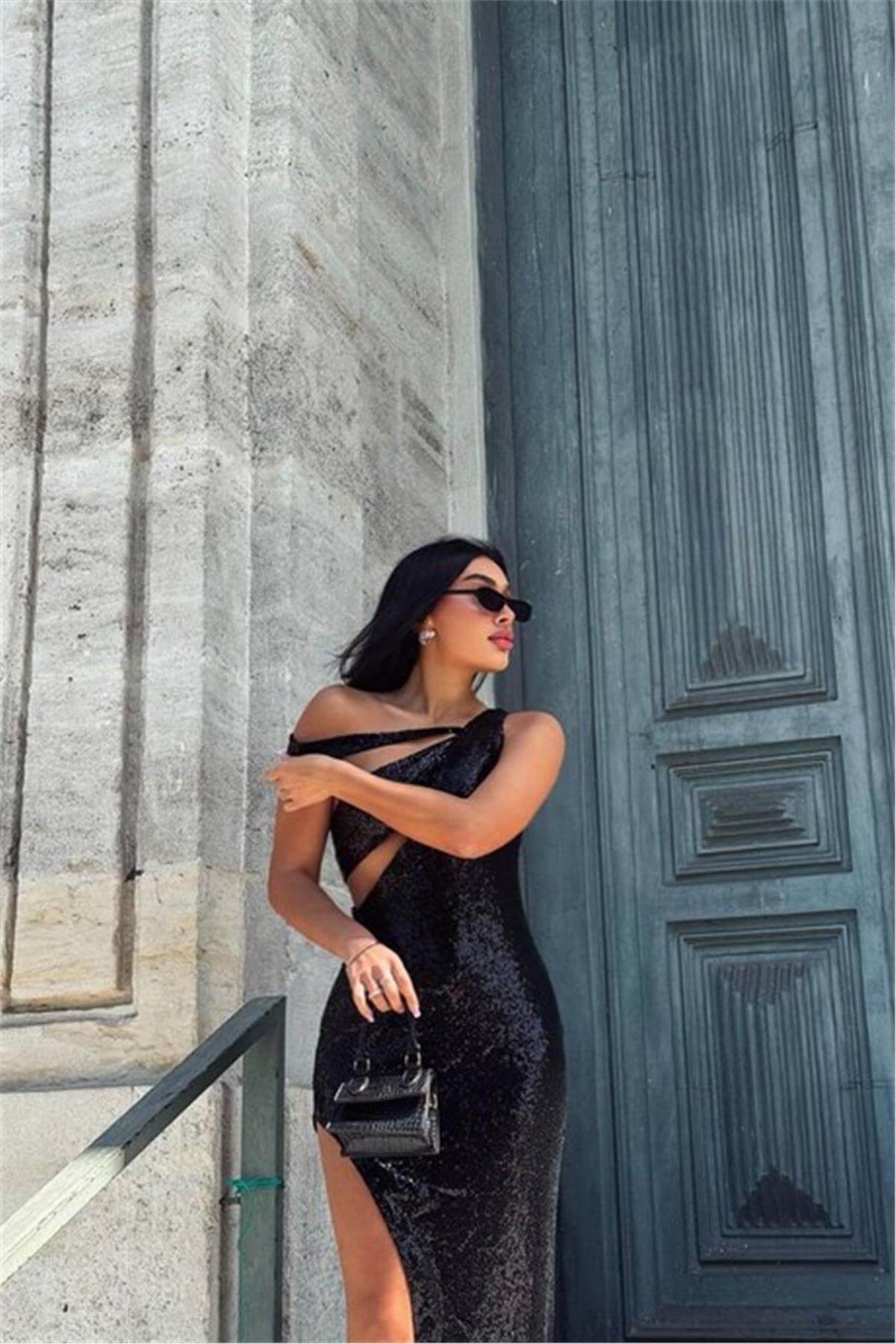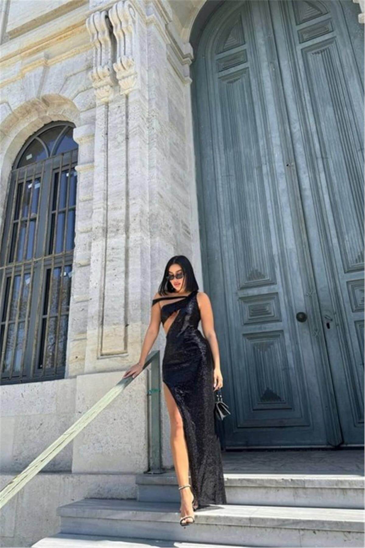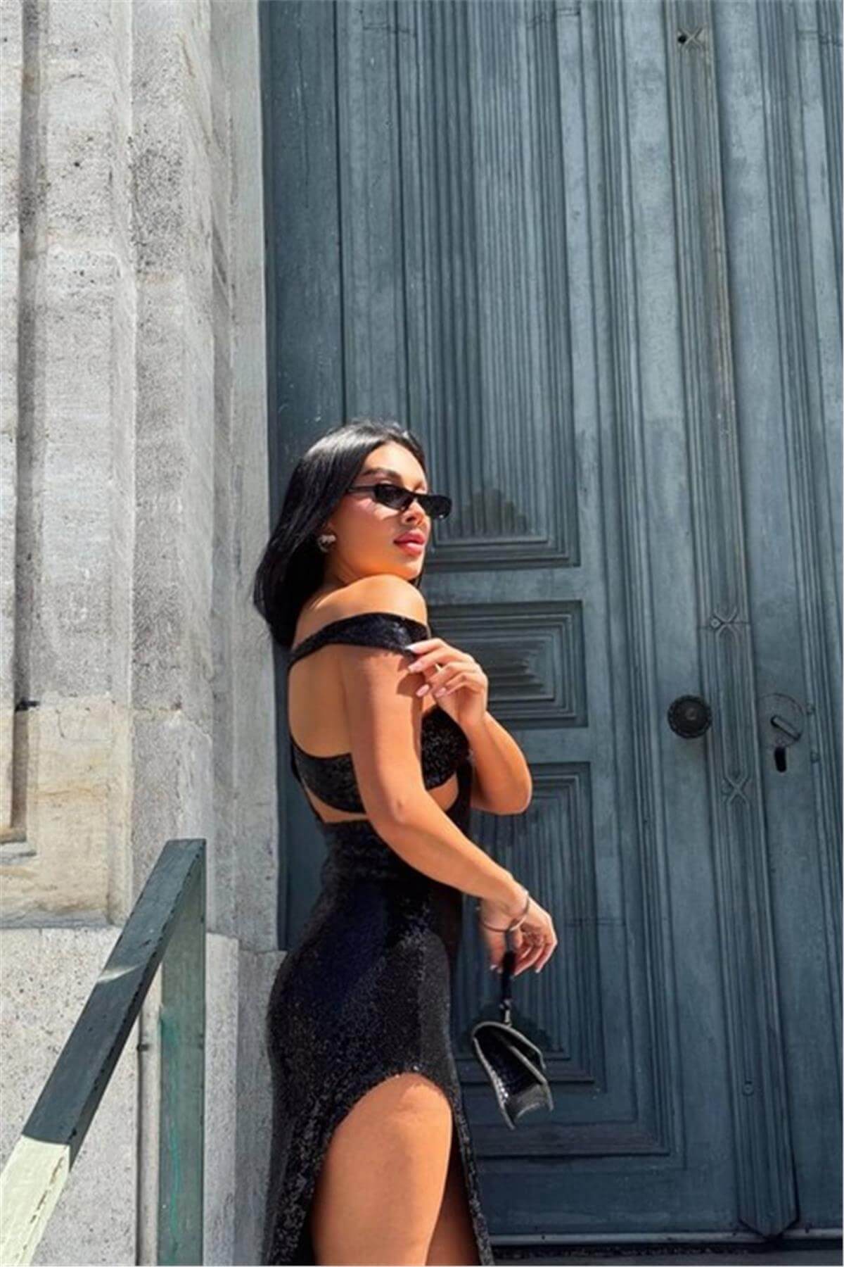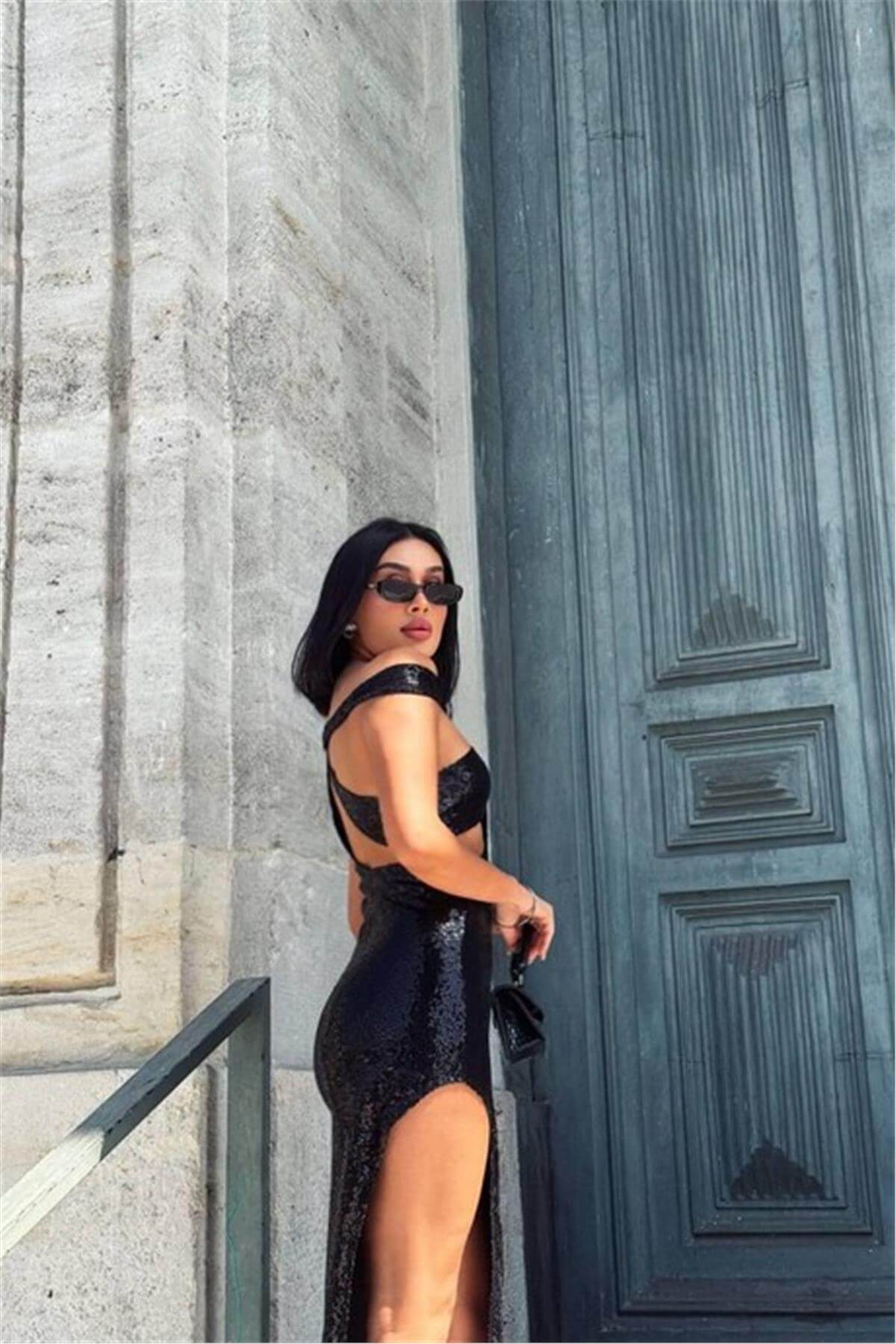 Göğüs Dekolteli Yırtmaçlı Siyah Pul Payet Elbise
