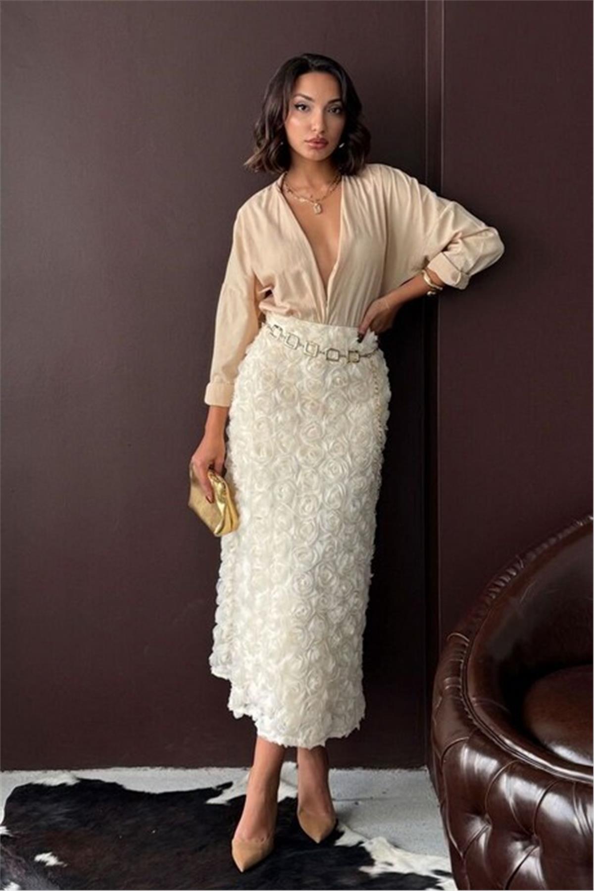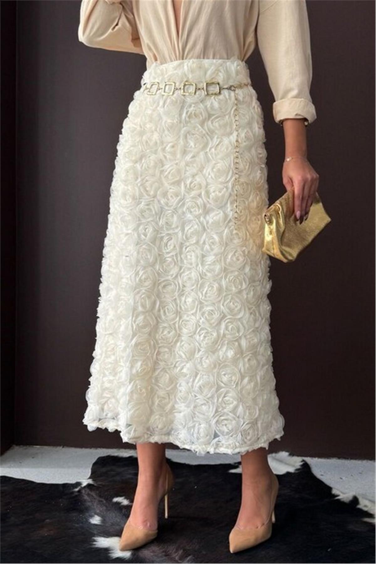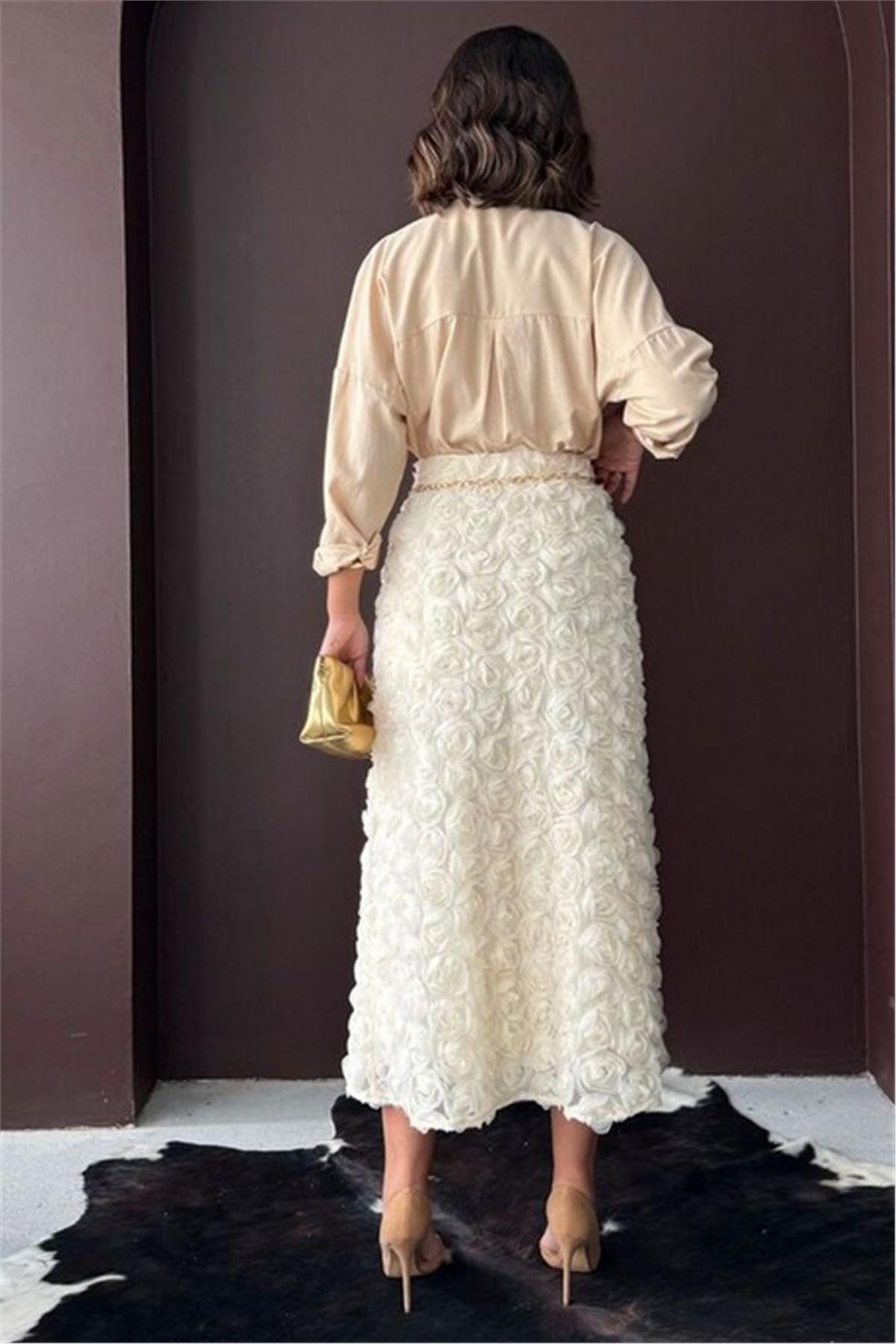 Gül Süzüneli Krem Uzun Etek