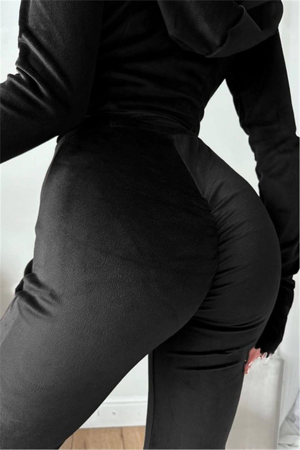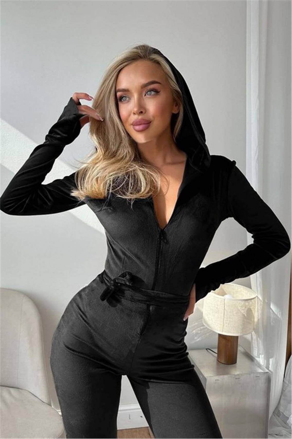 İspanyol Paça Kapüşonlu Kadife Siyah Tulum