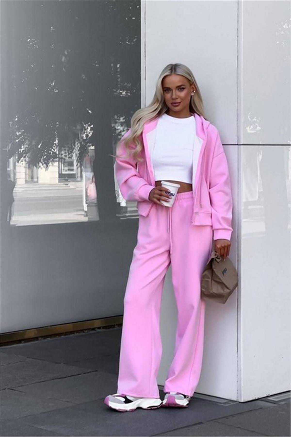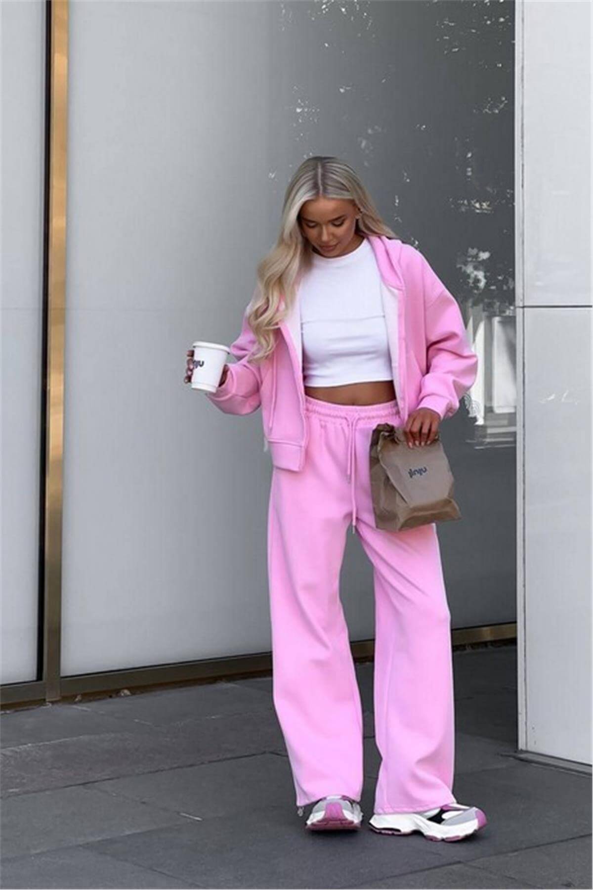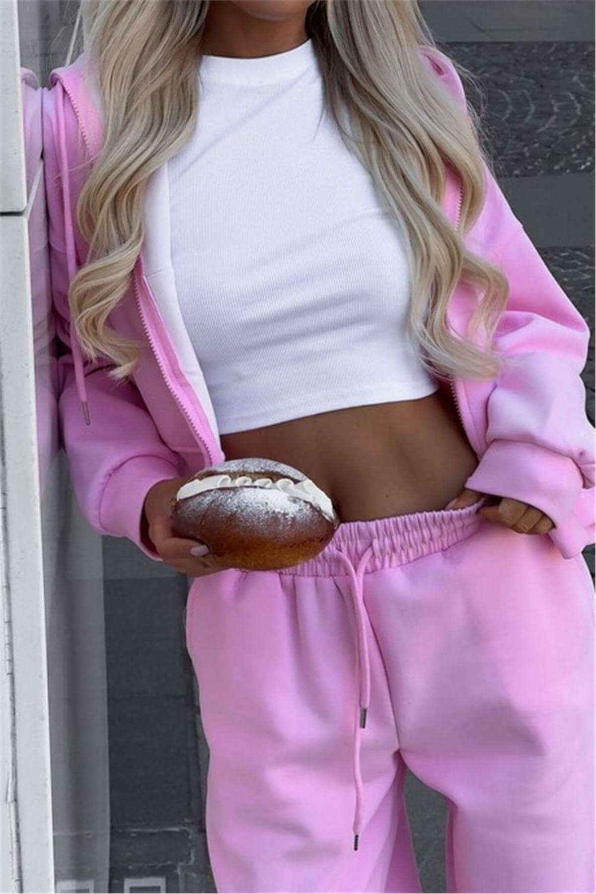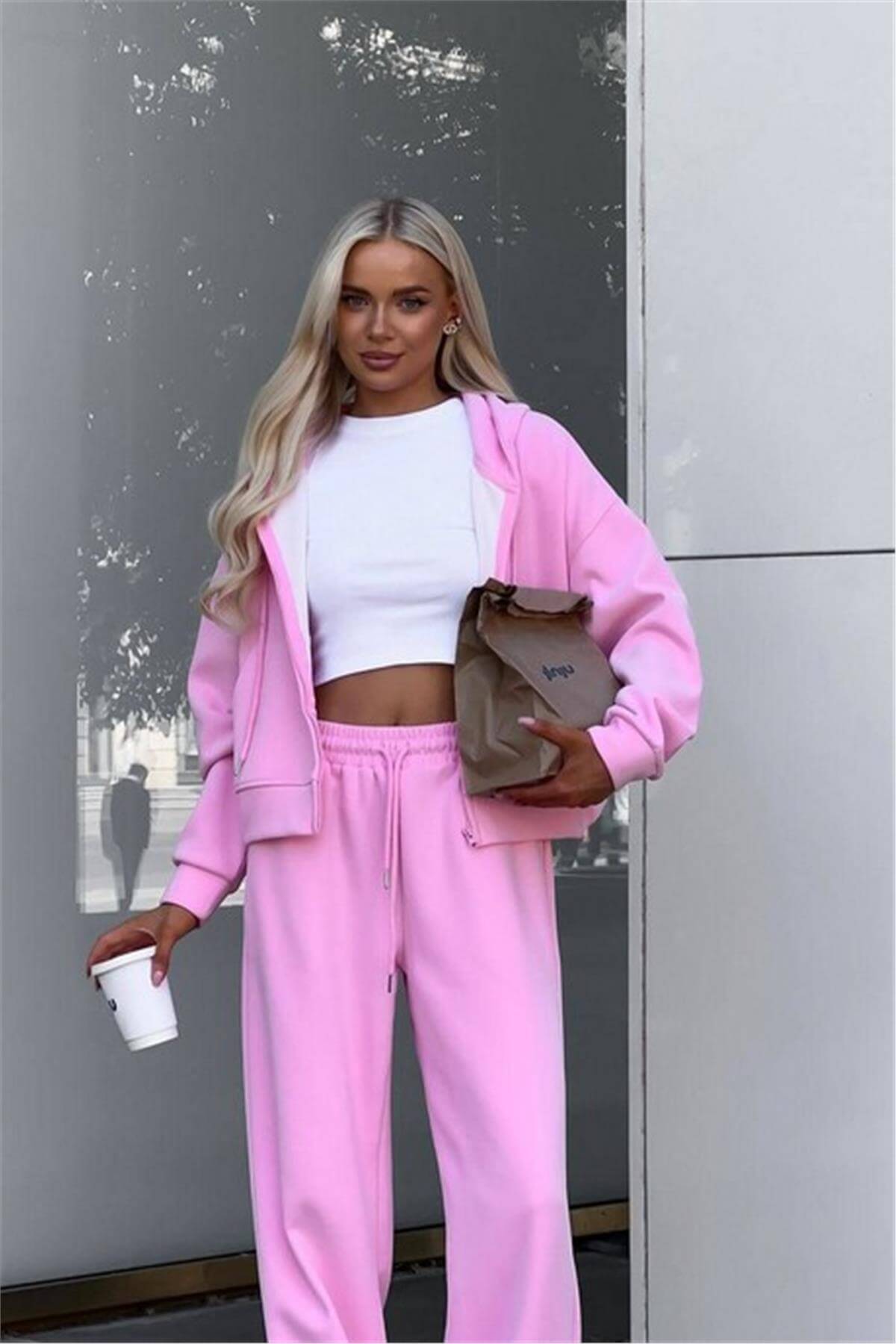 Kapüşonlu Fermuarlı Pembe Eşofman Takımı