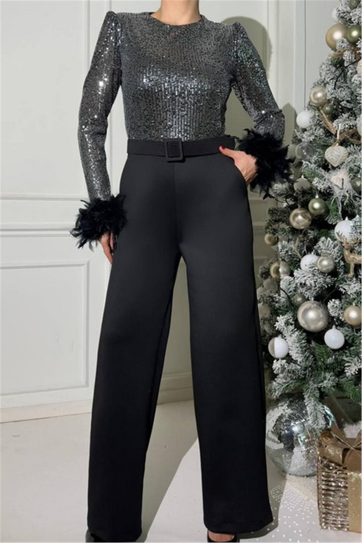 Kollar Tüylü Payet Gri Pantolon Tulum