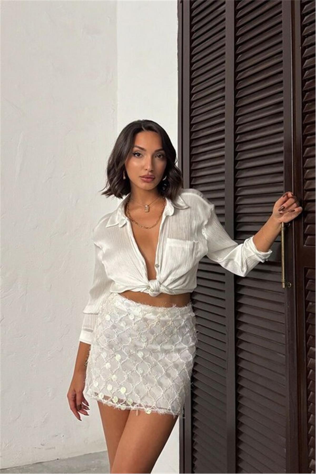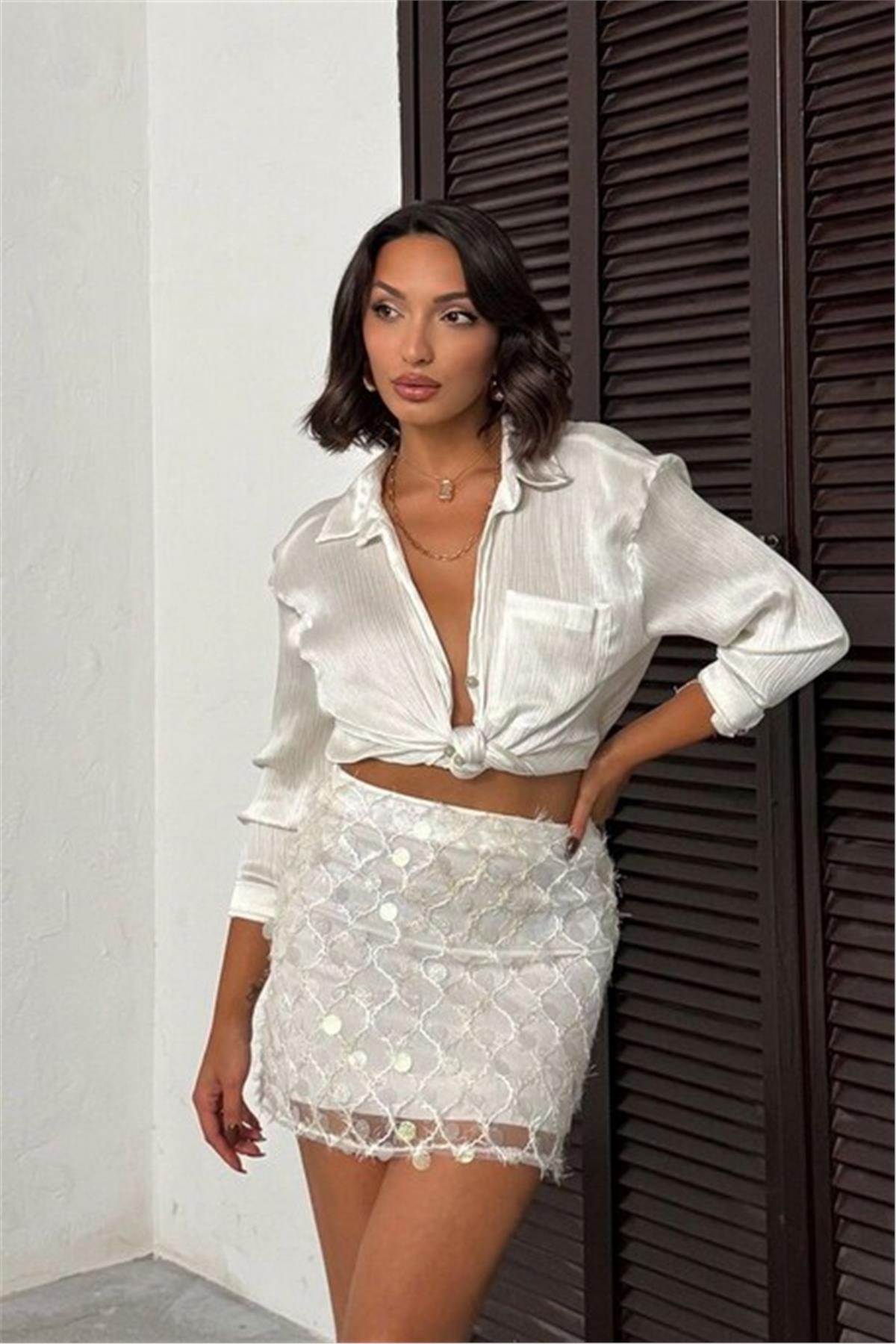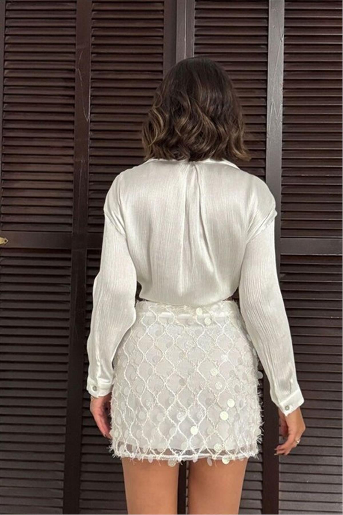 Pul Detaylı Beyaz Mini Etek