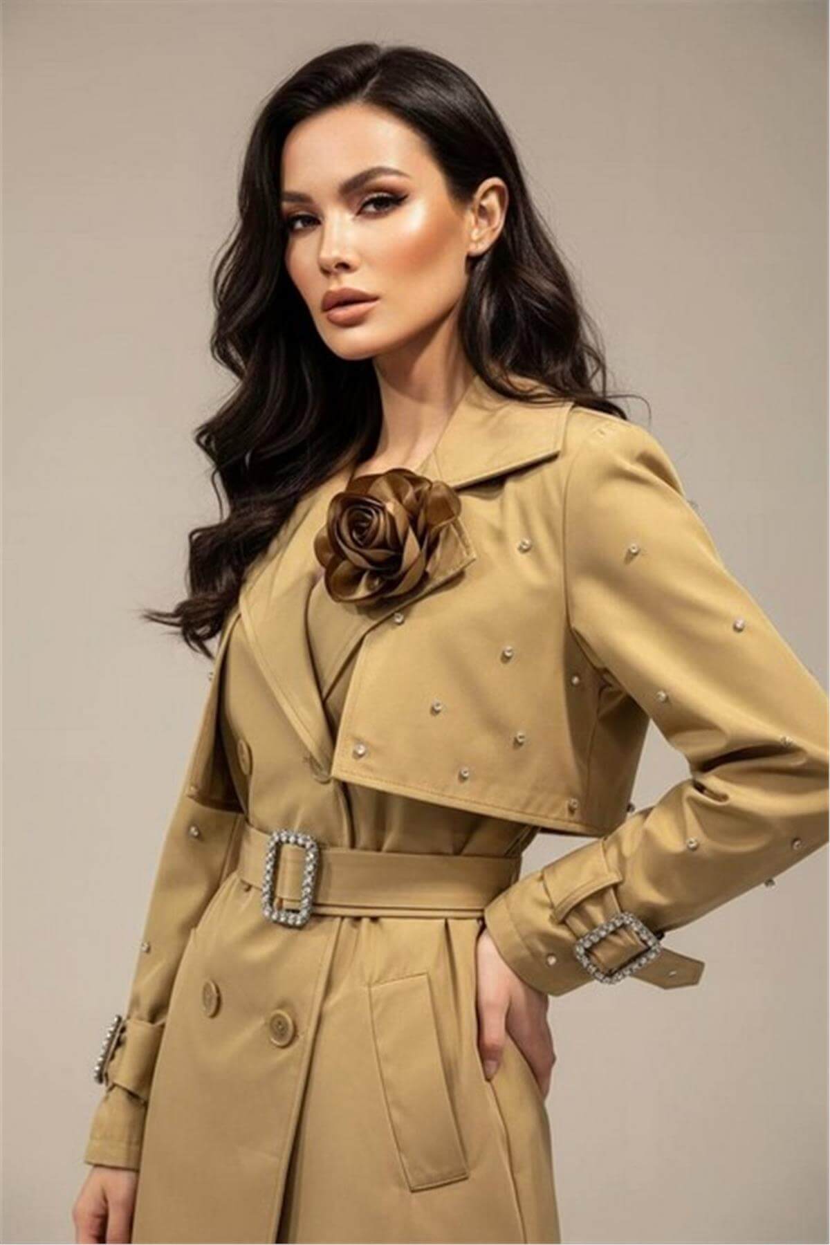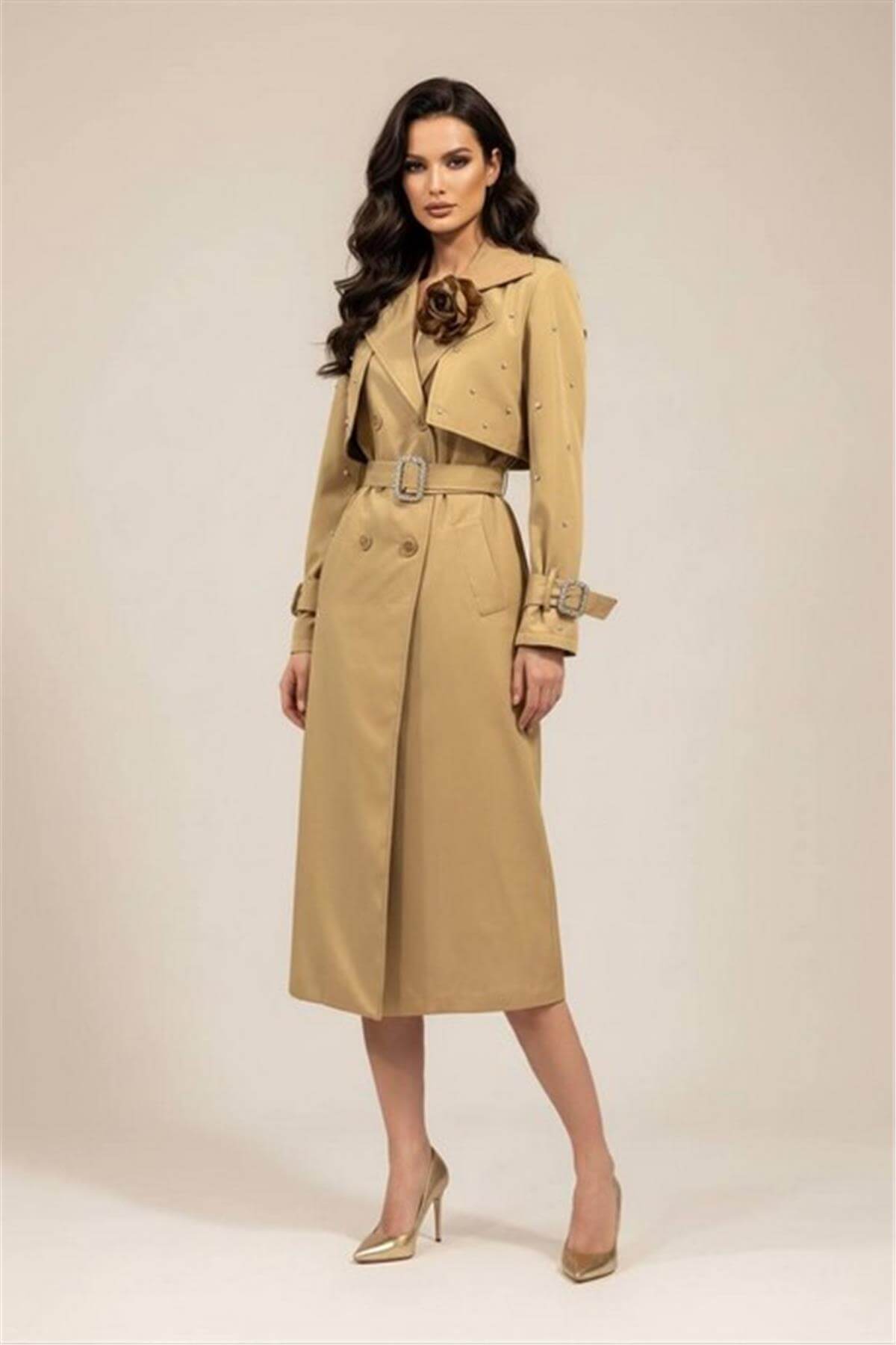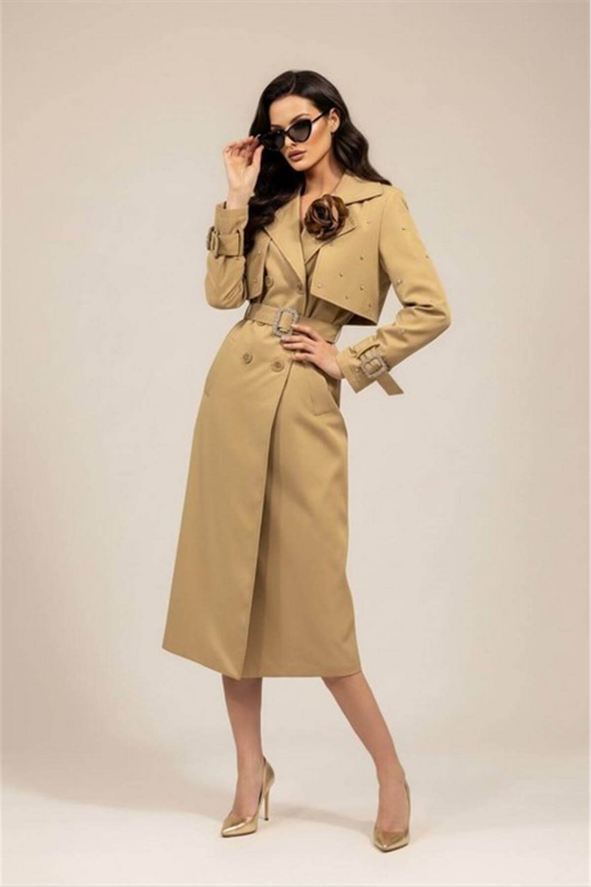 Taş İşleme Detaylı Açık Kahverengi Trençkot