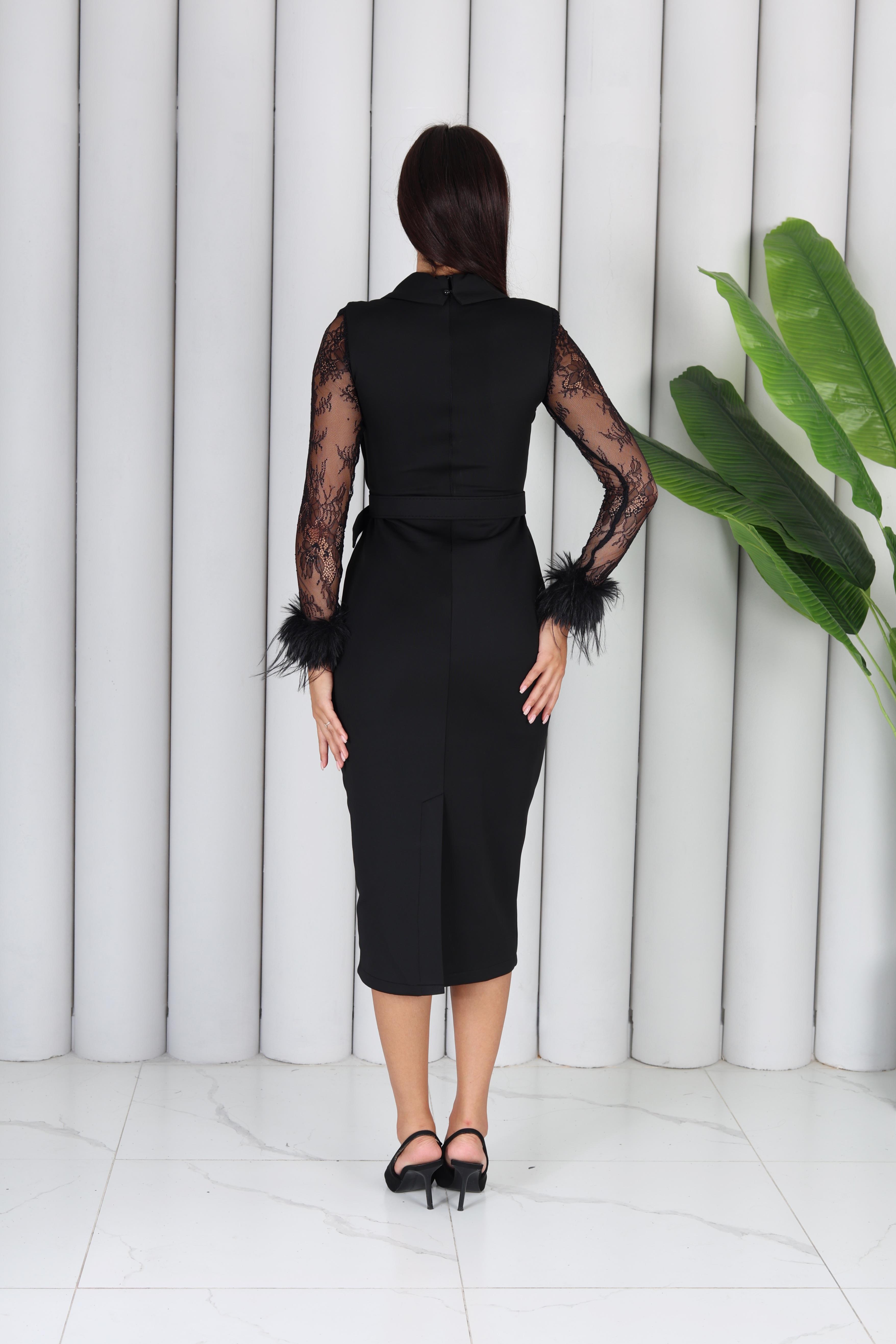 Tül Detaylı Kollar Tüylü Midi Boy Siyah Elbise