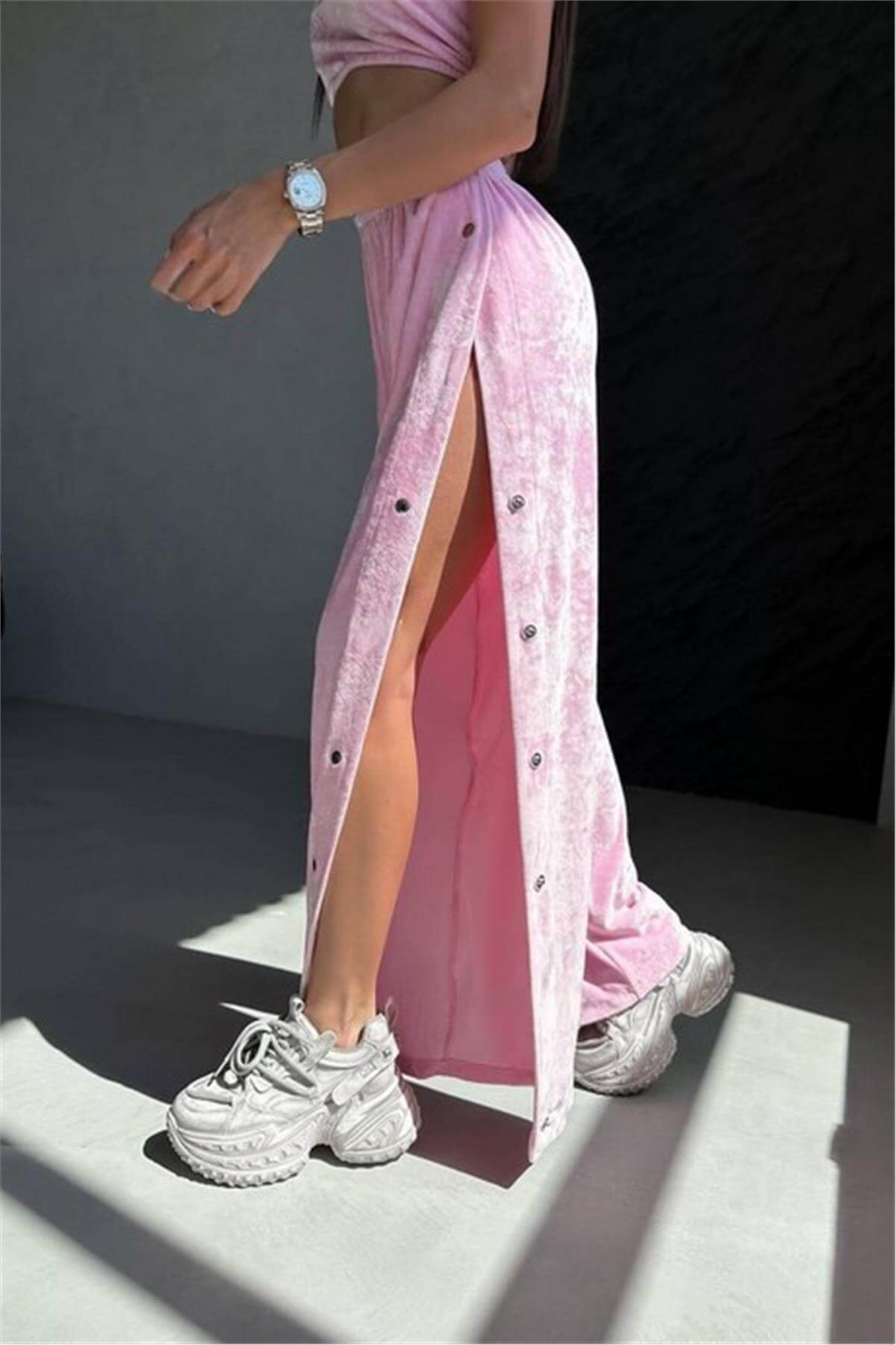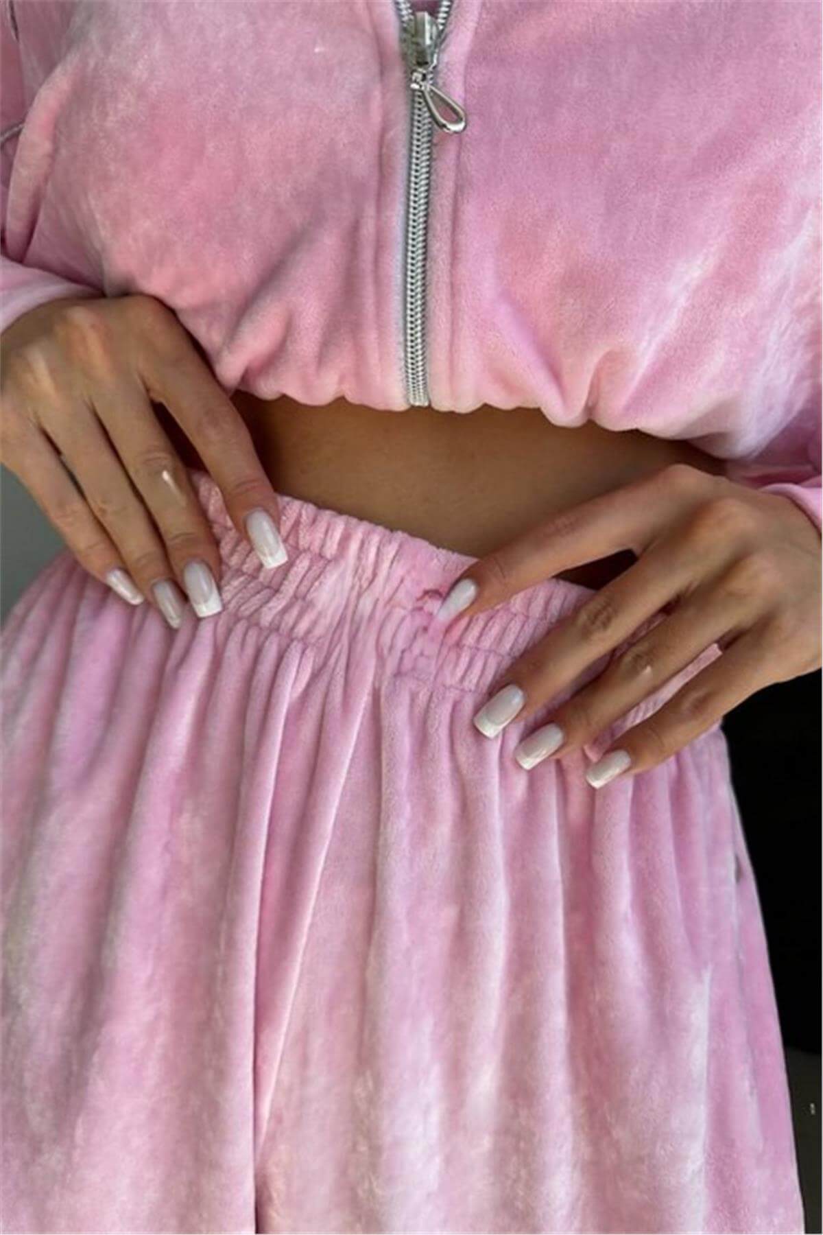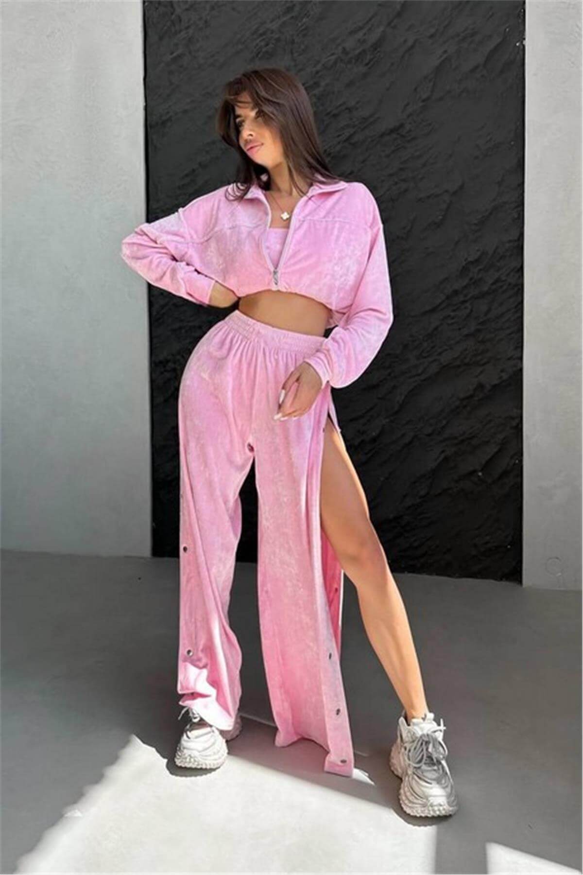 Üç Parça Kadife Çıtçıt Detaylı Pembe Eşofman Takımı