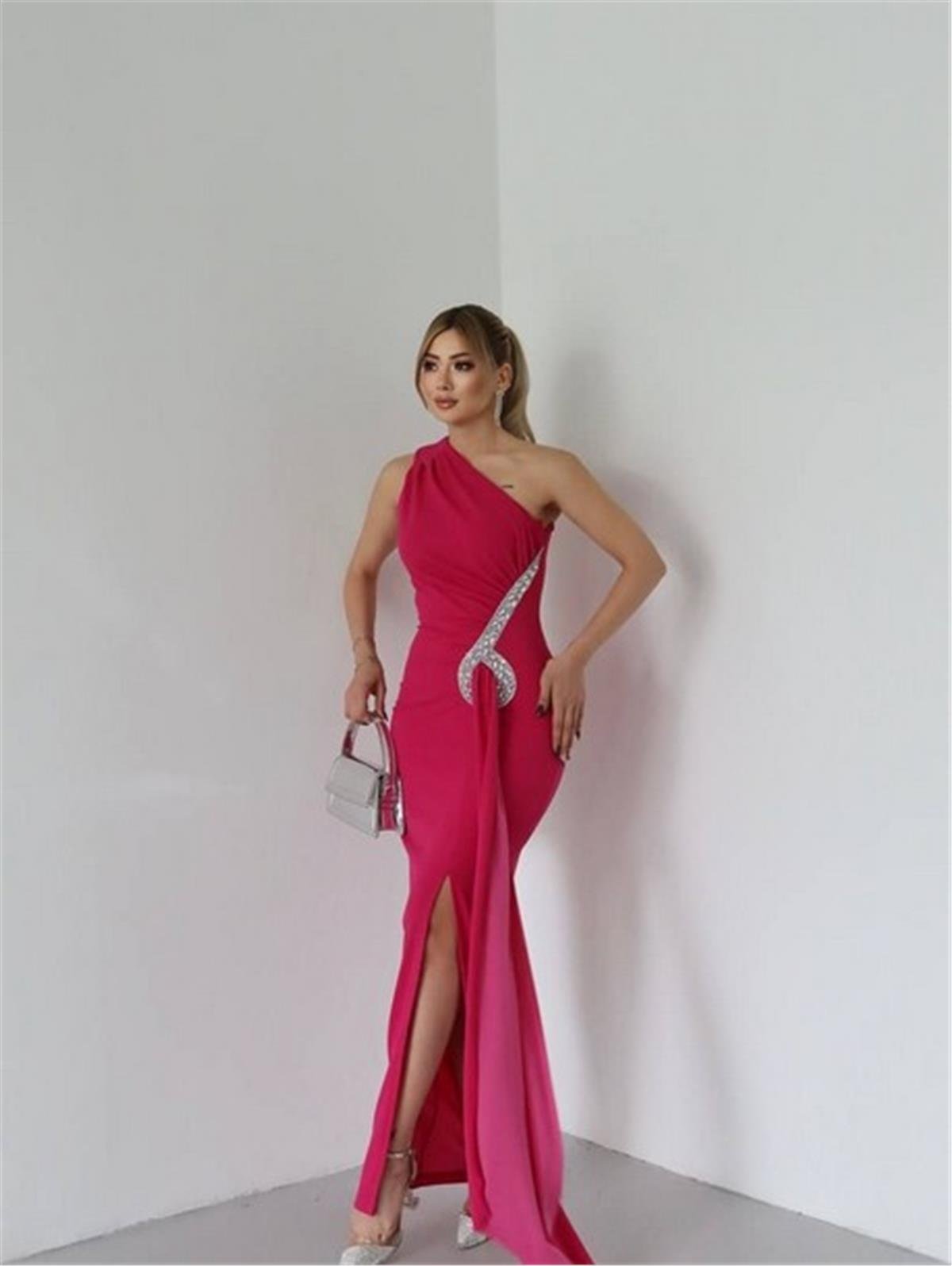 Yarım Omuz Bel Taşlı Kemer Detaylı Yırtmaçlı Pembe Elbise